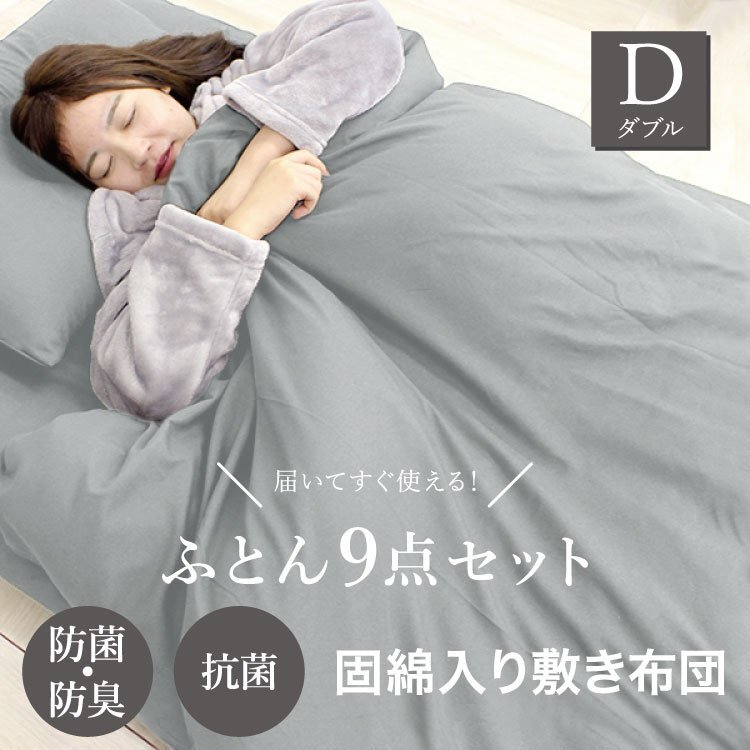 届いてすぐ使える寝具8点+収納ケースの9点セットです。 中綿には抗菌・防臭効果のある衛生的な中空ポリエステル綿を使用! 耐摩擦・耐久性に優れ、ホコリが出にくく睡眠の妨げとなるムズムズ感を軽減します。 アレルギーのある方や敏感肌の方におすすめです♪ 底付き感を感じないボリュームで、快適な寝心地とふんわり優しく包みこまれる気持ちよさを実現! また、抗菌防臭加工が施されており、いつでも清潔に使えます。 \すぐ使えるから、こんな方におススメ♪/ ・一人暮らしや新生活を始める方 ・新生活を始める方 ・来客者用の布団一式を考える方 ・布団、寝具の買い替えを考える方 ・社員寮など業務用として考える方 【商品内容】 掛け布団、敷き布団、まくら、掛け布団カバー、敷き布団カバー、まくらカバー、収納ケース 【商品詳細】 カラー:グレー サイズ:ダブル(詳細画像参照) 素材:ポリエステル (寝具セット ふとんセット カバーセット ふとんカバー 布団 おしゃれ 人気 おすすめ WEIMALL) |