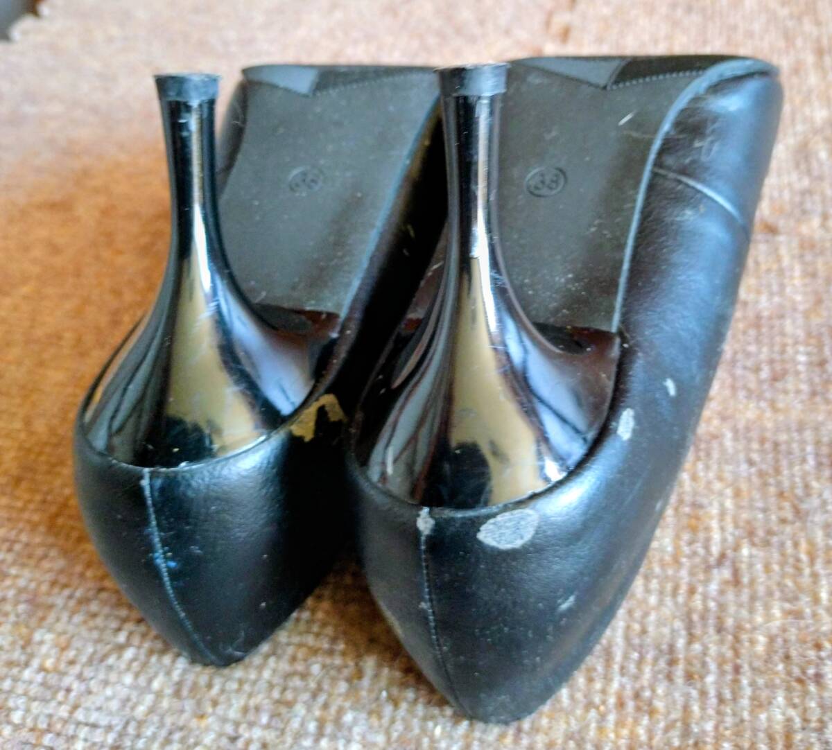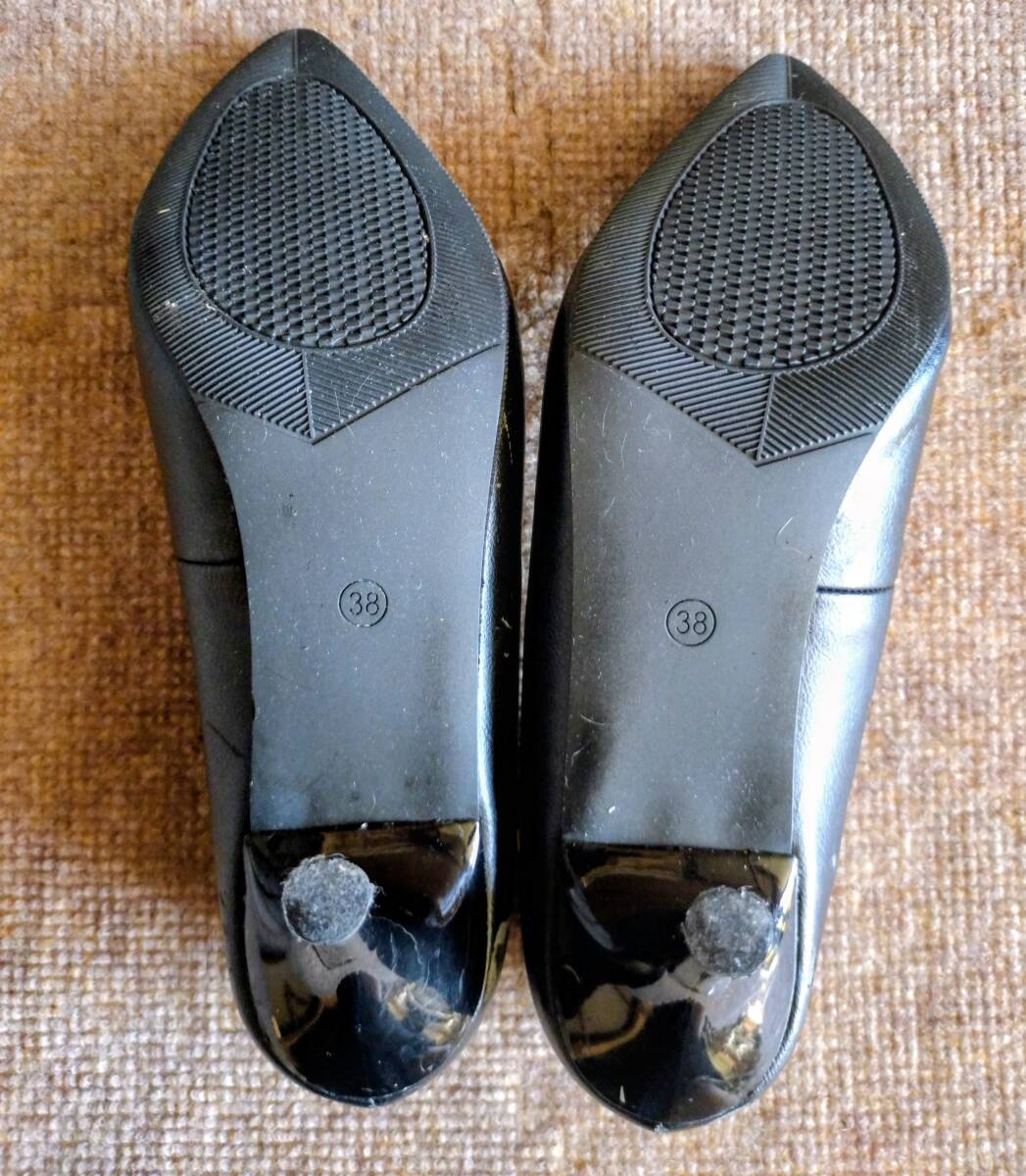 こちらのお色はブラックで、サイズは38とありますから、24センチに相当するかと思います。底甲幅は約8センチ、ヒール高さは約7センチとなっております。