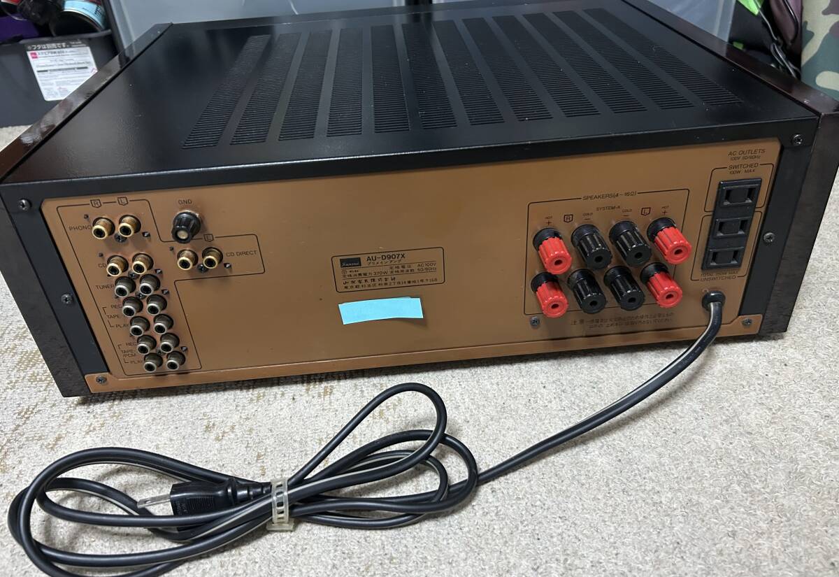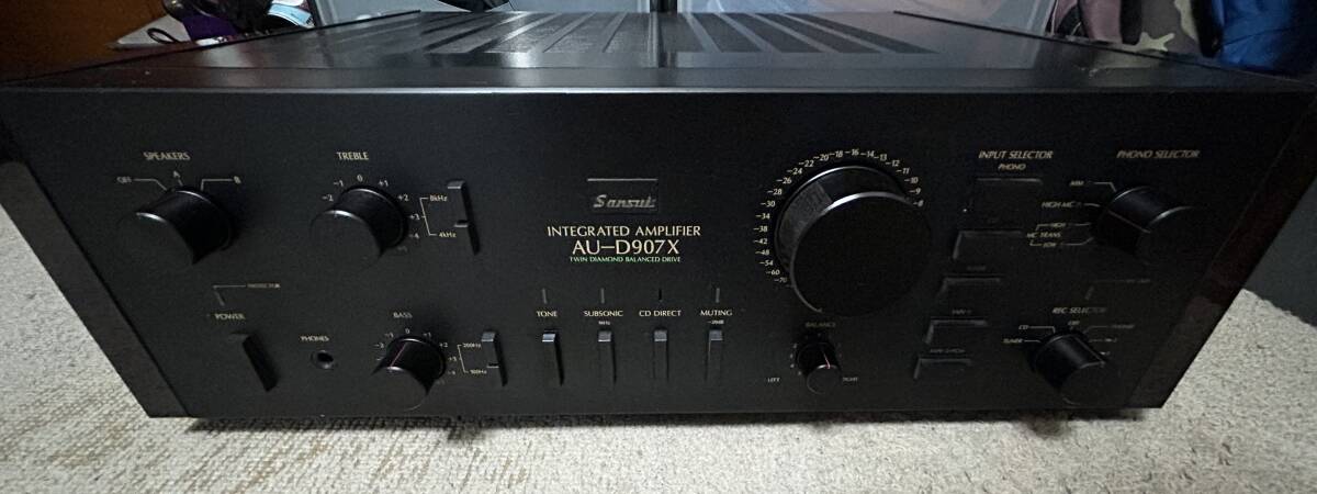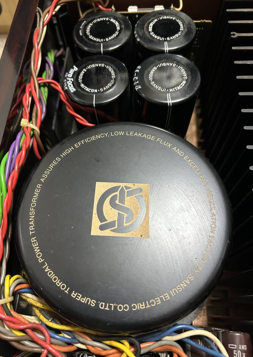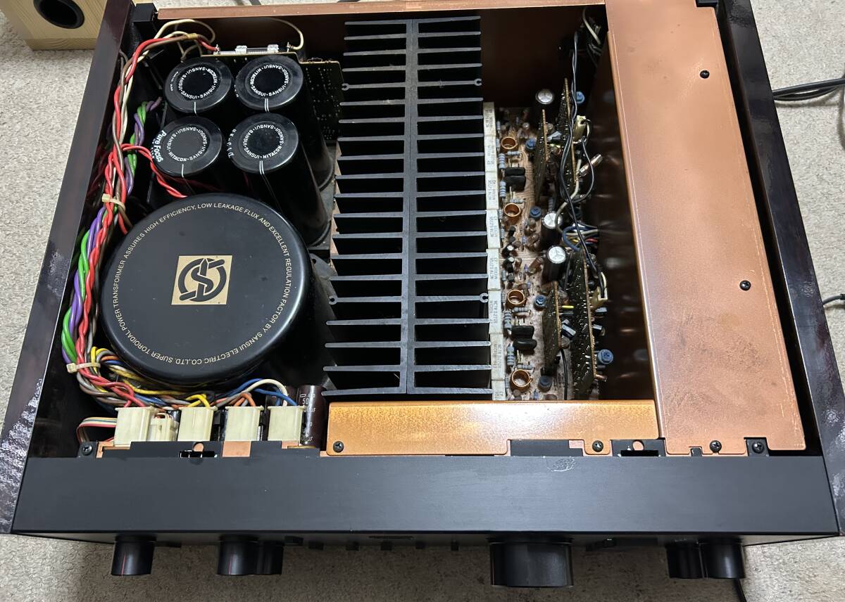 当然中古です。本体のみでリモコン設定はありません。2025年8月にメンテ行いました。内部徹底清掃、セレクター、ボリューム洗浄、端子磨き、外部パネル等洗浄。すごい電源で、最高にご機嫌サウンドです。MCトランス有り。ジャンル何でもいいです。スピーカー何でもいいです。じっと目をつぶって聞きたいほど、いい音質です。だからサンスイ人気が有るんです。不具合ありませんが、あまり稼働しないと微ガリ出るかもしれませんが、40年前の製品ですので、ご理解ください。電源投入時は、昔のアンプなので、ポップ音が出ます。お好きなお酒を飲みながら、貴方だけの最高の時間が手に入ります。嫌な仕事なんぞ忘れてください。神経質な方は入札ご遠慮下さい。後で必ずクレームをつけられますので。是非新品をお買い下さい。説明や音質のニヤンスは主観性に基づいていますのでノークレームをお守りください。落札後のキャンセルは一切できません。キャンセルの場合は落札価格の20%の支払いをしてもらいます。伝票の到着日から3日間で、動作確認をして下さい。それ以降製品に不具合があれば、ご自身で修理の手配をして下さい。配送の事故等もご自身でご対応を御願いします。精密機器なのでヤマト運輸宅配便着払いのみ対応します。発送は主に土、日曜日になりますし、厳重梱包致しますが使い回しの材料が含みます。他の発送方法はできませんし元払いもいたしません。以上守れる方のみ入札して下さい。スムーズなお取引をしたいと思っております。【製品特徴】Xバランスアンプです。差動バランス入力構成、バランス出力構成、バランス・フィードバック構成、バランス電源方式、バランス電流ドライブ構成、ツイン・ダイアモンド・バランス差動回路という6つの技術で構成されており、入力から出力、電源、フィードバックに至るまでの全てをバランス・アンプとすることで伝送・増幅系をアースから完全分離しています。出力段は2組のダーリントン出力段と差動プッシュプル増幅段によるバランス構成としています。また、バランス出力段の2つのアンプそれぞれにNFBをかけるバランス・フィードバック構成としており、実動作時の歪や特性が大幅に改善されています。プリドライブ段にはダイアモンド差動回路を活用したツイン・ダイアモンド・バランス差動回路を採用しています。この回路は、4つの出力を利用して2組の出力段アンプをバランス・プッシュプル・ドライブします。ノンアース・アンプを実現するため、ツイン・ダイアモンド・バランス差動回路を用いて電圧-電流変換を行い、バランス電流伝送を実現しています。電源部にはバランス電源構成を採用しています。バランス電源ではアースが完全に分離されており、また、従来電源では不可欠だったセンタータップもなく、スピーカーへアンバランス電流やリップル電流が流れこむことがありません。家庭用電源(100V)に含まれるノイズ成分もバランス電源構成のためキャンセルされ、アンプに混入することがありません。この電源部には高性能トロイダルトランスと50φx110mmのピュア・フォーカスコンデンサーとαコンデンサーを4本採用しており、トータル160,000ミリ・ジュールの静電エネルギーによってピーク時にも十分な電流エネルギー供給を可能にしています。また、パワーアンプ部はプリドライブ段とパワー部、左右チャンネルを独立させた4電源方式によって安定度を高めています。CDダイレクトあり。フォノは、MMてイコライザー直結のHi-MCポジション、MCトランス(High、Low切替)が設けられています。MCトランスには、磁性特性の優れたマグネティックINC.社(USA)製スーパー・パーマロイコアを用いたモノラルタイプを2個搭載したスーパー・リニアステップ型。主要小型電解コンデンサーにはAWD高性能タイプを使用し、小容量フィルムコンデンサーには銅箔スチロールコンデンサーを採用しています。大型重量級アルミブロックヒートシンクを採用しています。電磁気歪を防止する銅メッキシャーシを使用しています。サイドウッドにはミラー仕上が美しい。実効出力(両ch駆動)180W+180W(6Ω)160W+160W(8Ω)250W+250W(4Ω)、全高調波歪率0.003%、混変調歪率(60Hz:7kHz=4:1)0.003%(8Ω、実効出力時)、出力帯域幅5Hz~80kHz、ダンピングファクター(新IHF、20Hz~20kHz)100(6Ω)、周波数特性(1W)DC~300kHz +0 -3dB、入力感度/入力インピーダンス(1kHz)Phono MM:2.5mV/47kΩ、Phono High MC:2.5mV/100ΩPhono MC Low:100μV/3.2Ω(MCトランス採用)、Phono MC High:300μV/40Ω(MCトランス採用)、CD、Tuner、Tape1、2:150mV/47kΩPhono最大許容入力(1kHz、THD 0.01%)、MM:300mV、High MC:300mV、MC High:35mV(トランス方式)、出力レベル/インピーダンスTape rec:150mV/600ΩRIAA偏差(MM、Rec out)20Hz~300kHz ±0.2dB、SN比Phono MM:90dB、 MC:80dB以上(100μV)、CD、Tuner、Tape:110dBトーンコントロールBass:±10dB、Treble:±10dB、定格消費電力(電気用品取締法)370W、外形寸法幅466x高さ161x奥行431mm、重量20.5kg。