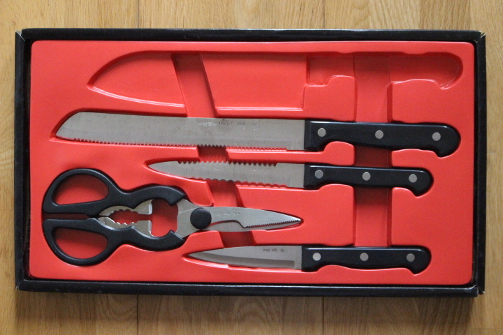 画像にある物が全てで、箱のふたはありません。 種類:冷凍包丁、魚包丁、ペティナイフ、キッチンハサミ
