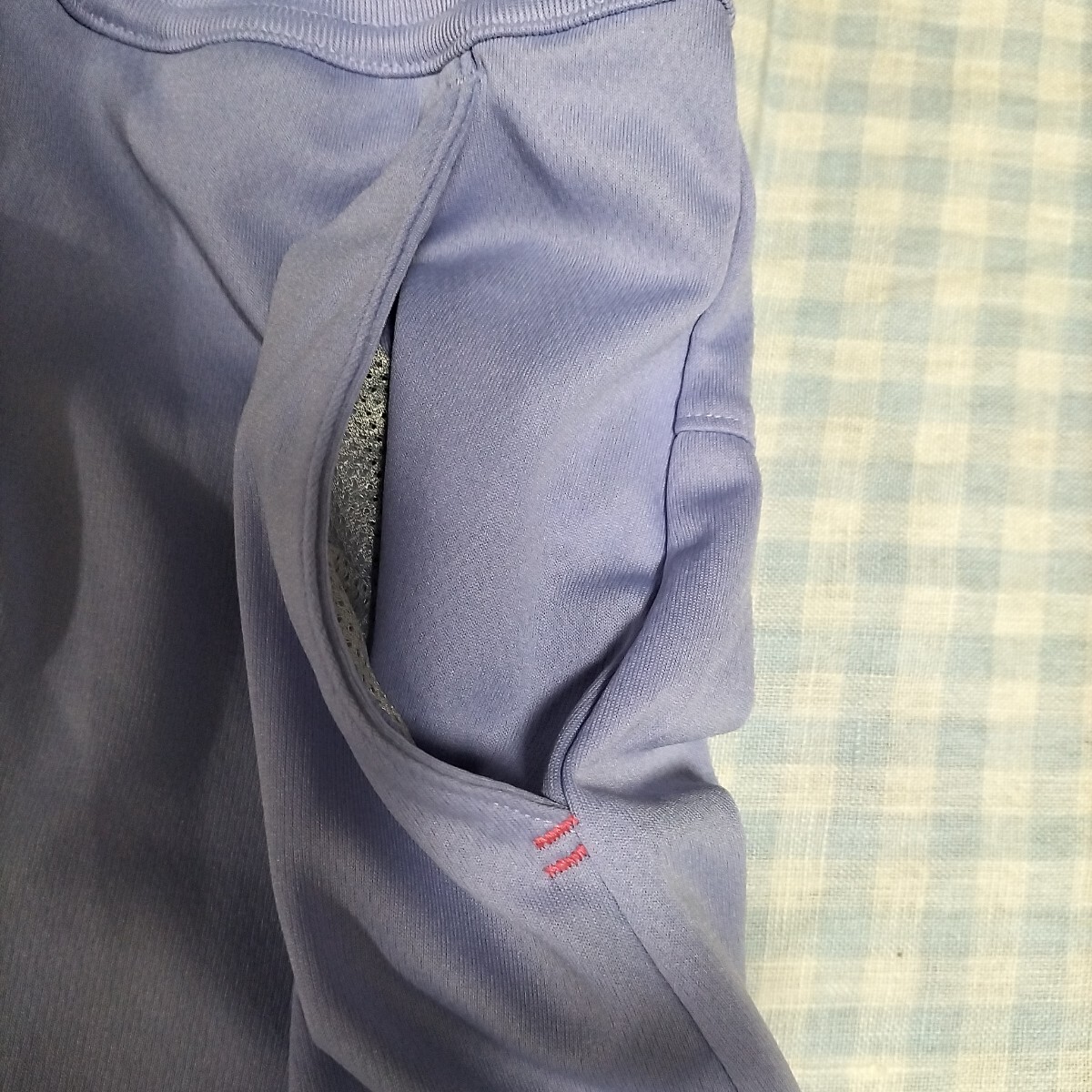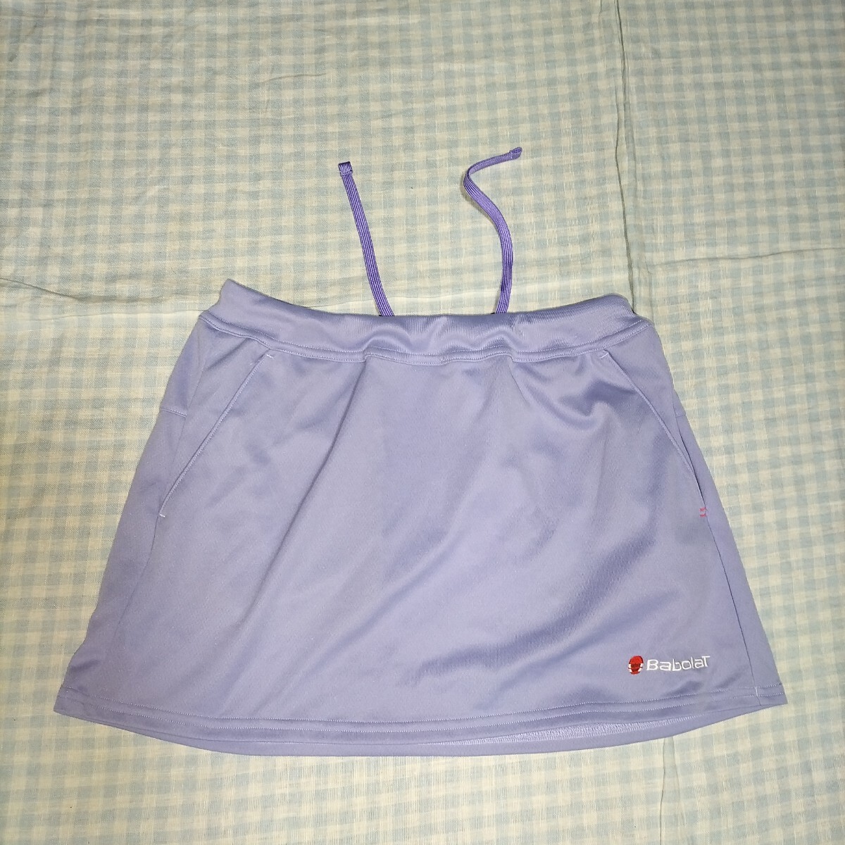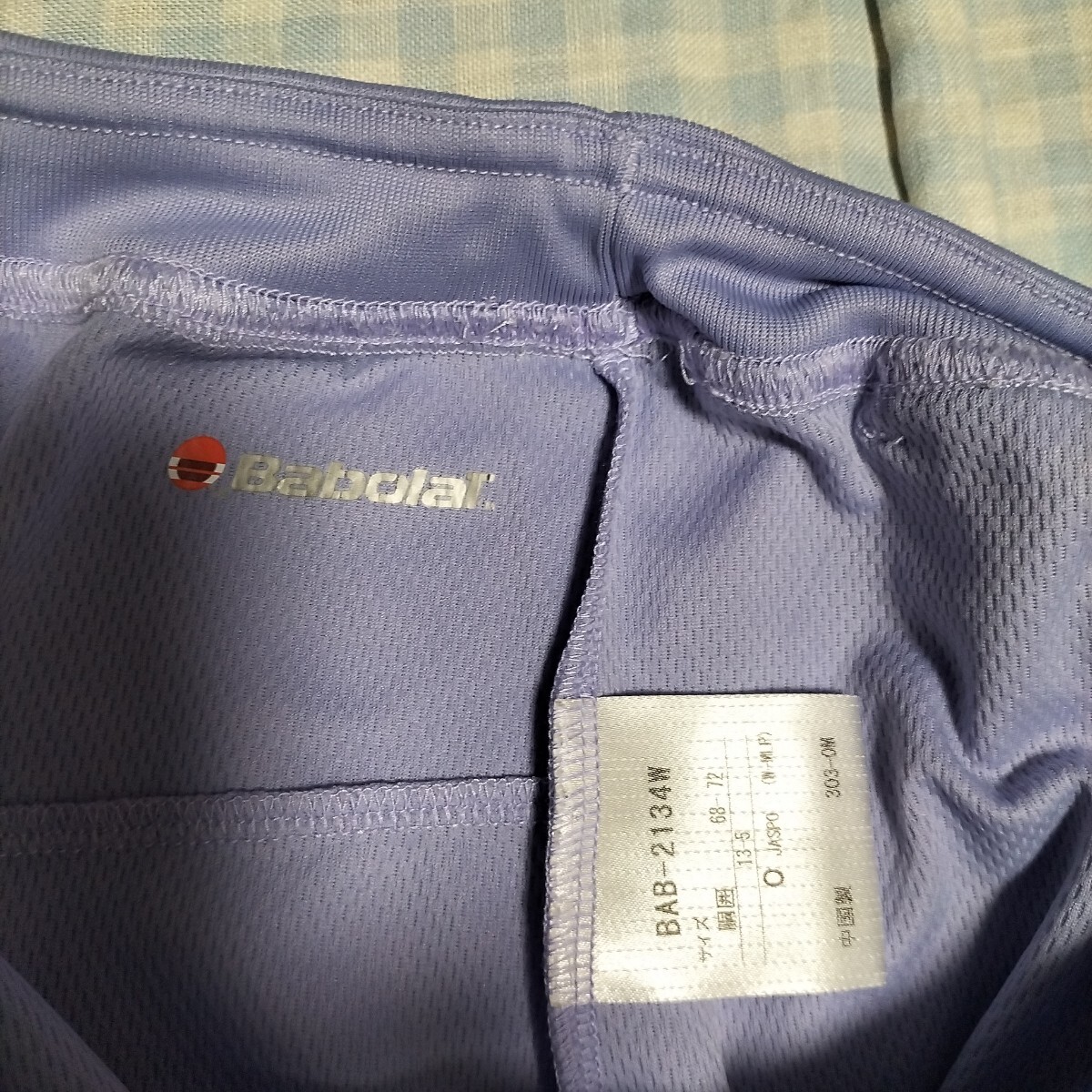 色は薄紫 後ろに白のロゴのプリント 左右ポケットあり。 ポケットの付け根にステッチがあり、左はピンクで2本、右は生地と同色のうす紫で1本です。サイズはOですが、私は他のテニスウェアのMくらいだと思います。実寸:ウエスト66cm〜80cm着丈33cm