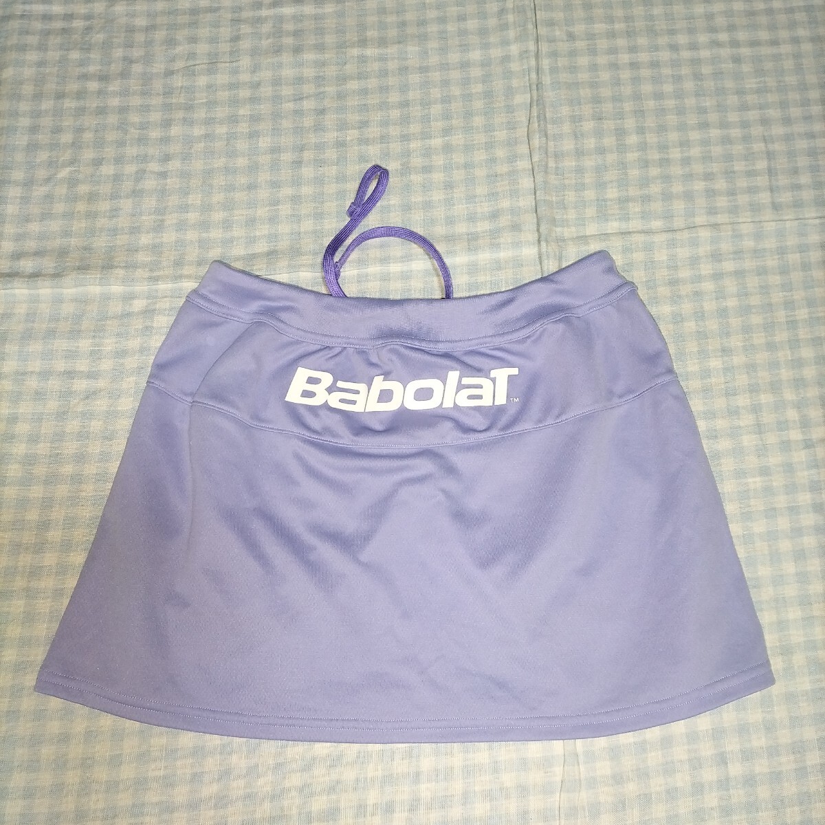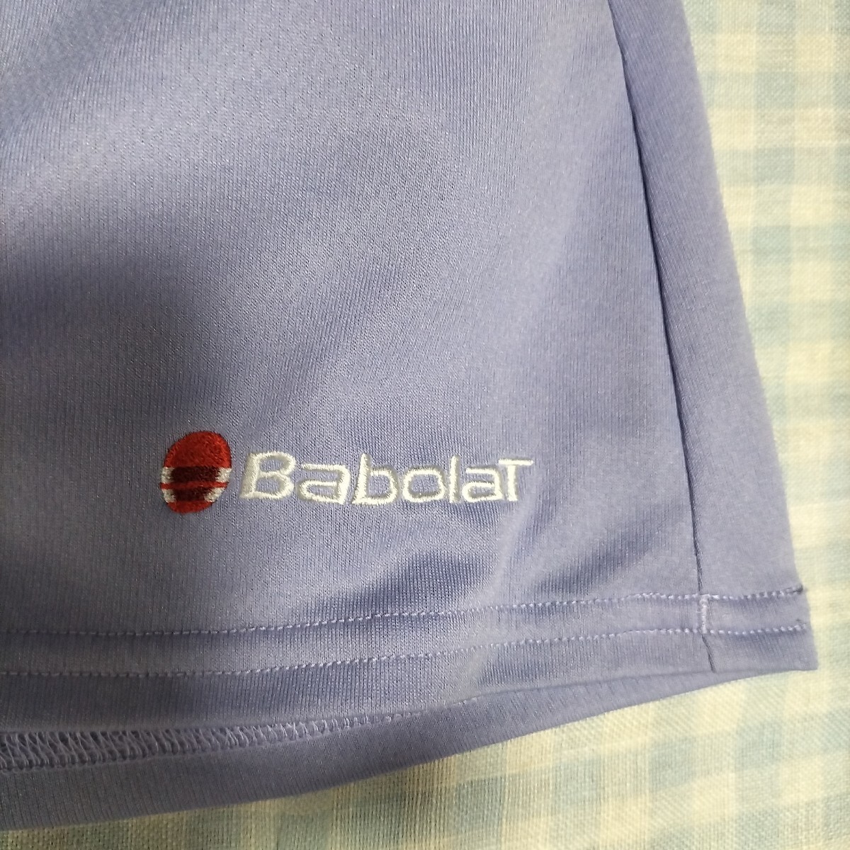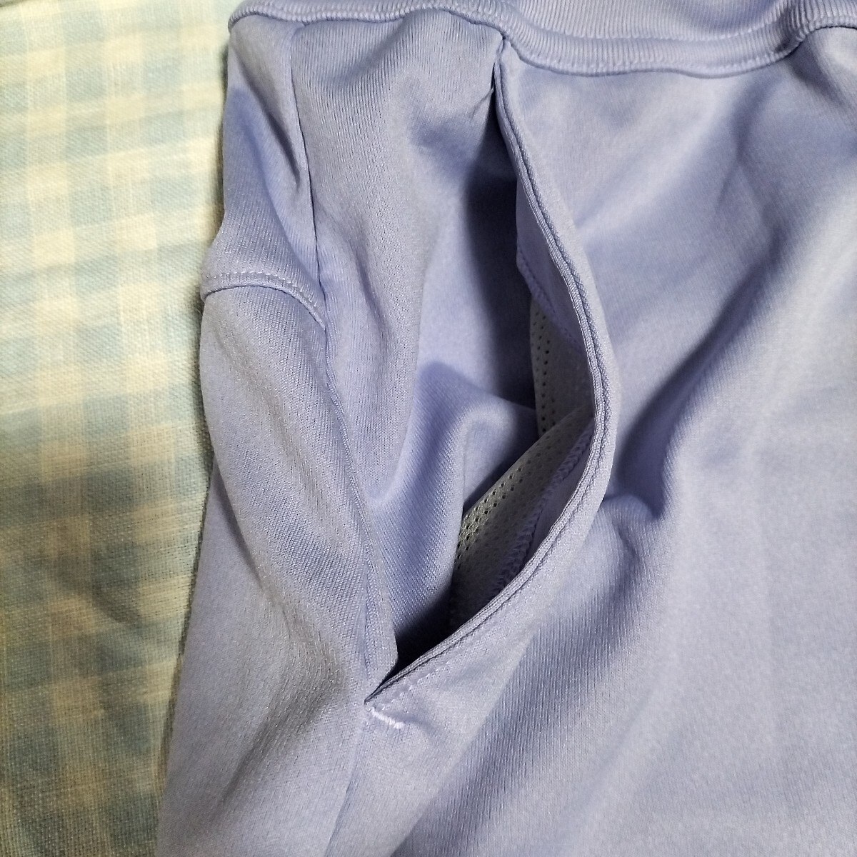 色は薄紫 後ろに白のロゴのプリント 左右ポケットあり。 ポケットの付け根にステッチがあり、左はピンクで2本、右は生地と同色のうす紫で1本です。サイズはOですが、私は他のテニスウェアのMくらいだと思います。実寸:ウエスト66cm〜80cm着丈33cm