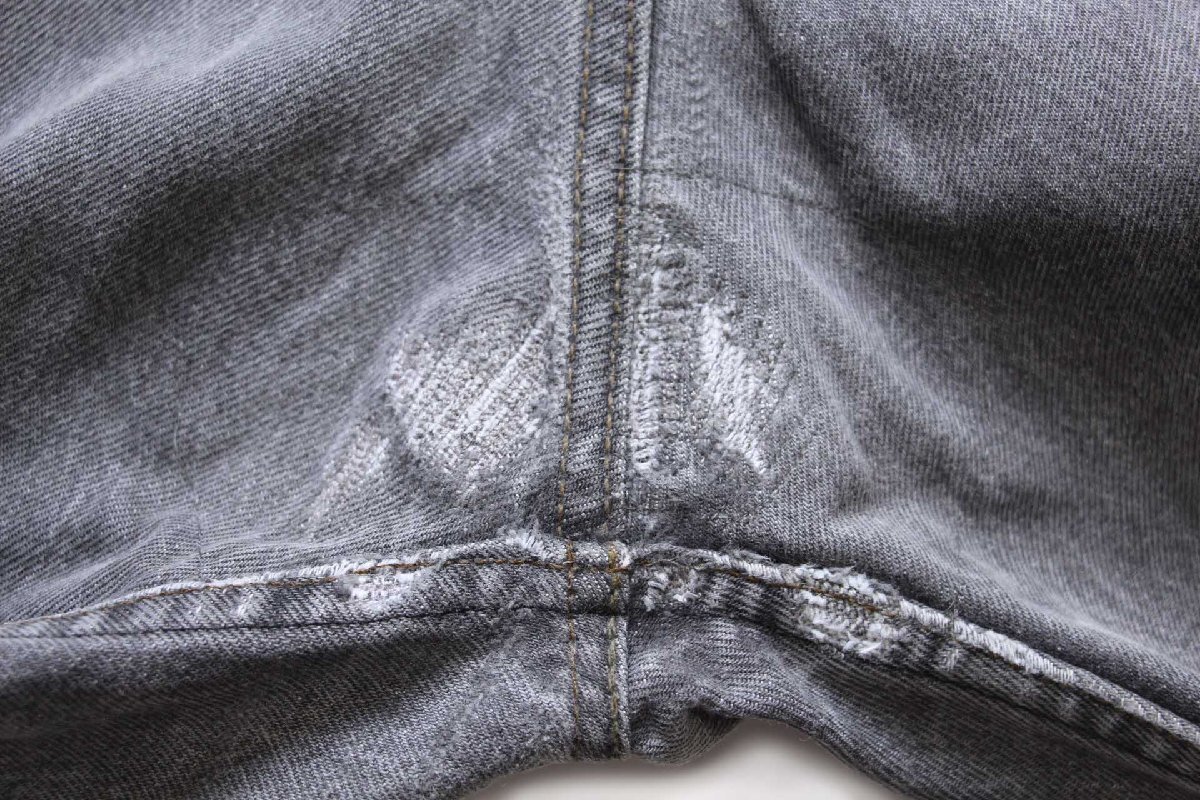 コンディション:着用感があり、全体的に色落ち、左サイド上部に浅い擦れ、股付け根にリペア(タタキ)があります。目立つダメージや汚れはなく、生地もしっかりしていて、古着慣れされている方なら問題なく着用いただける程度です。