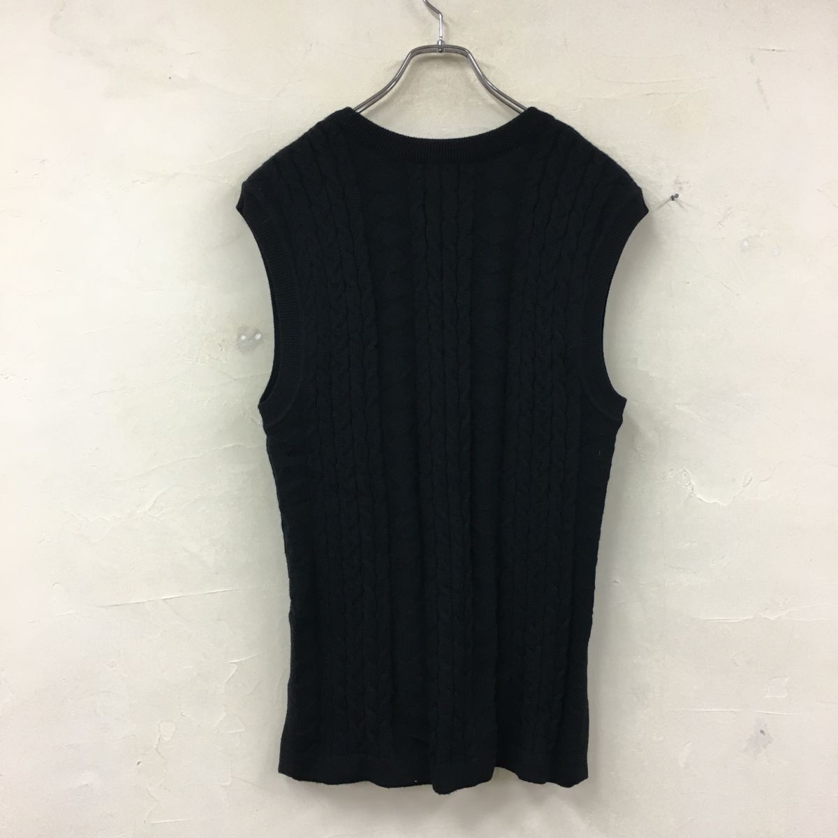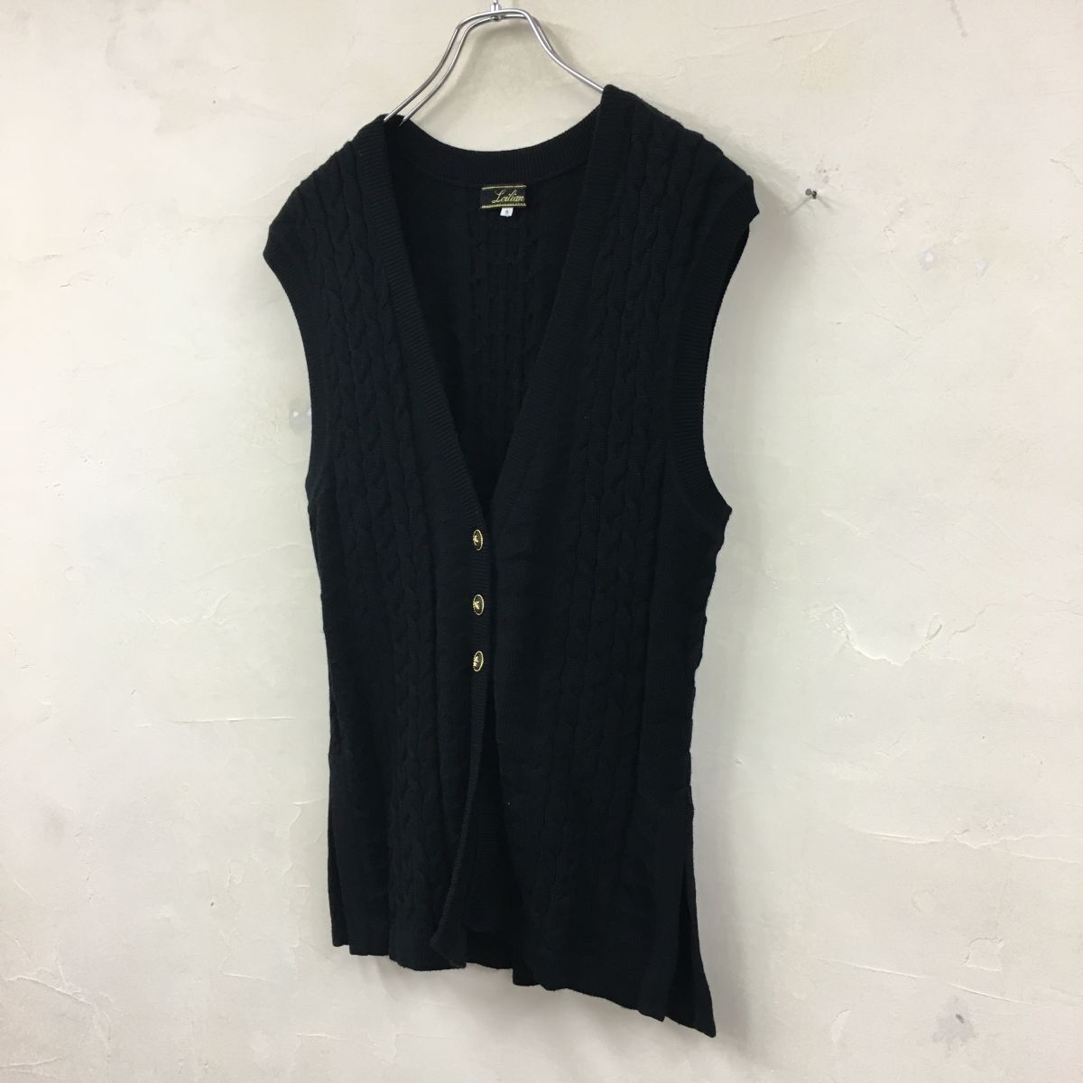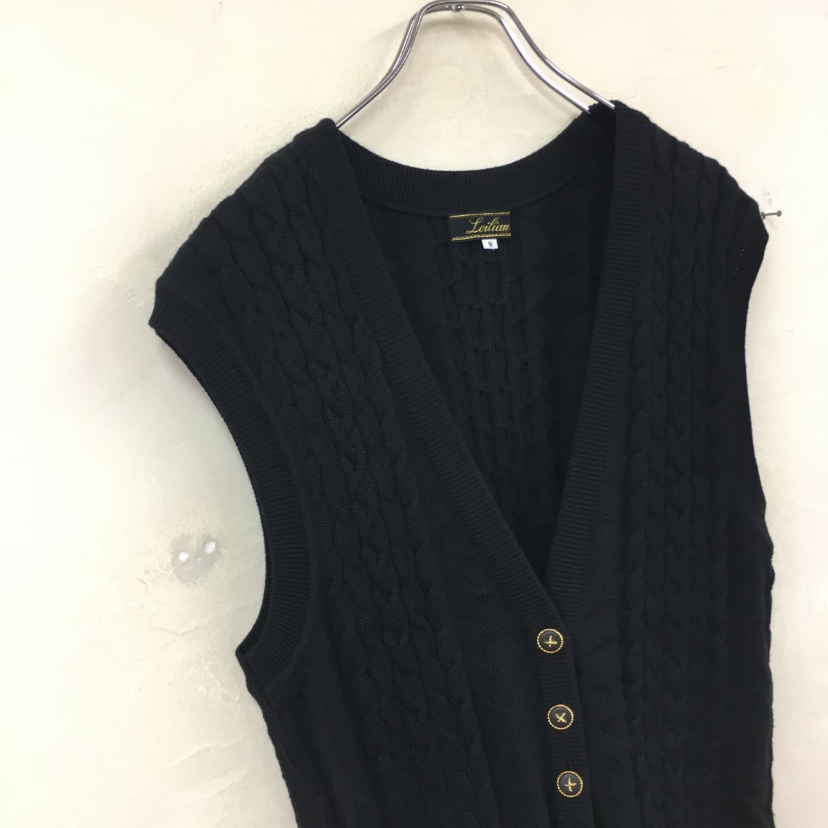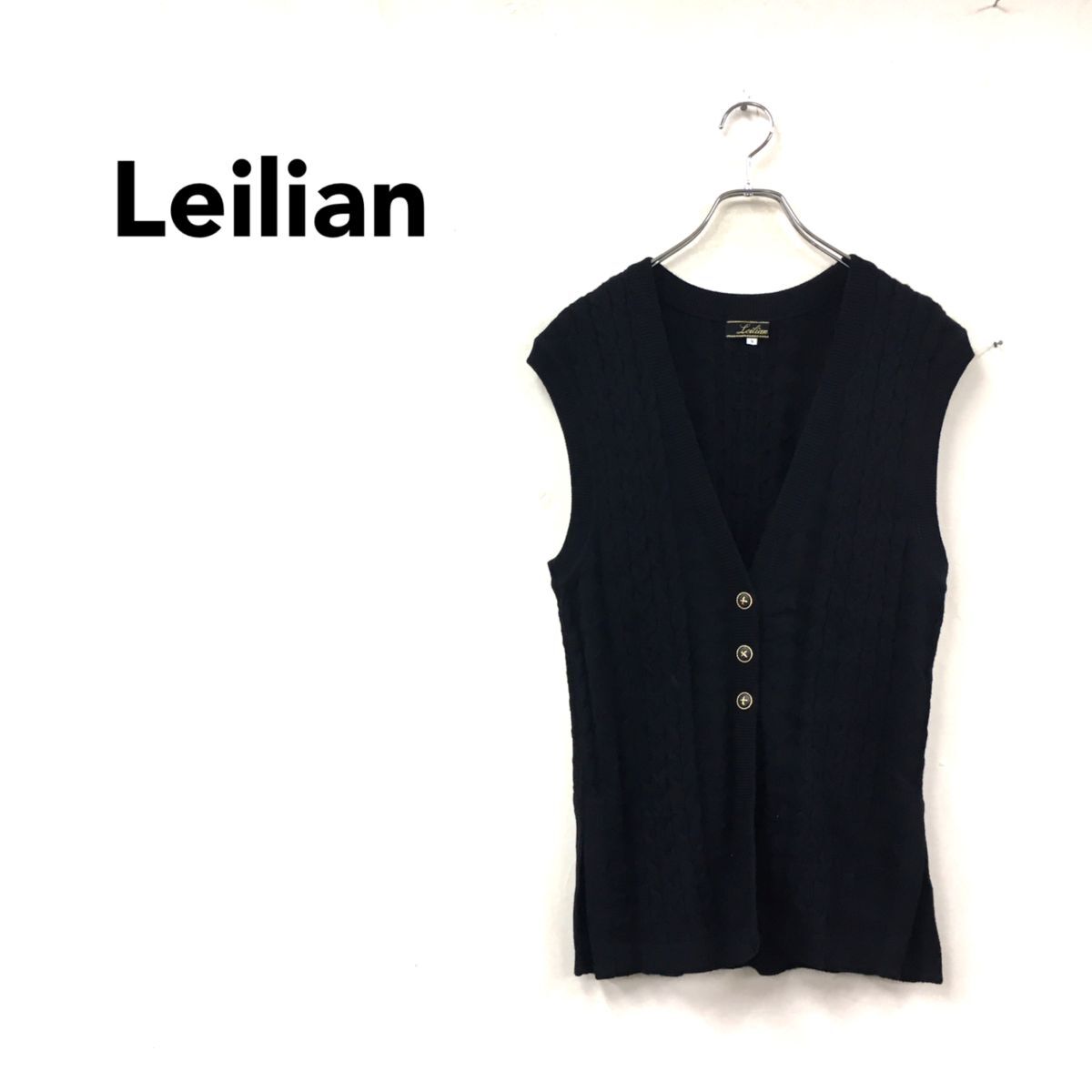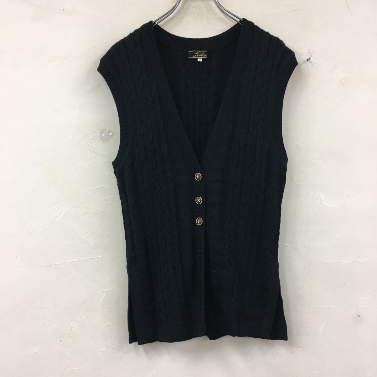 2O1896-G-N◆良品◆ Leilian レリアン サイドスリットケーブルウールニットベスト Vネック デザインボタン 無地 ◆ size9 黒 毛