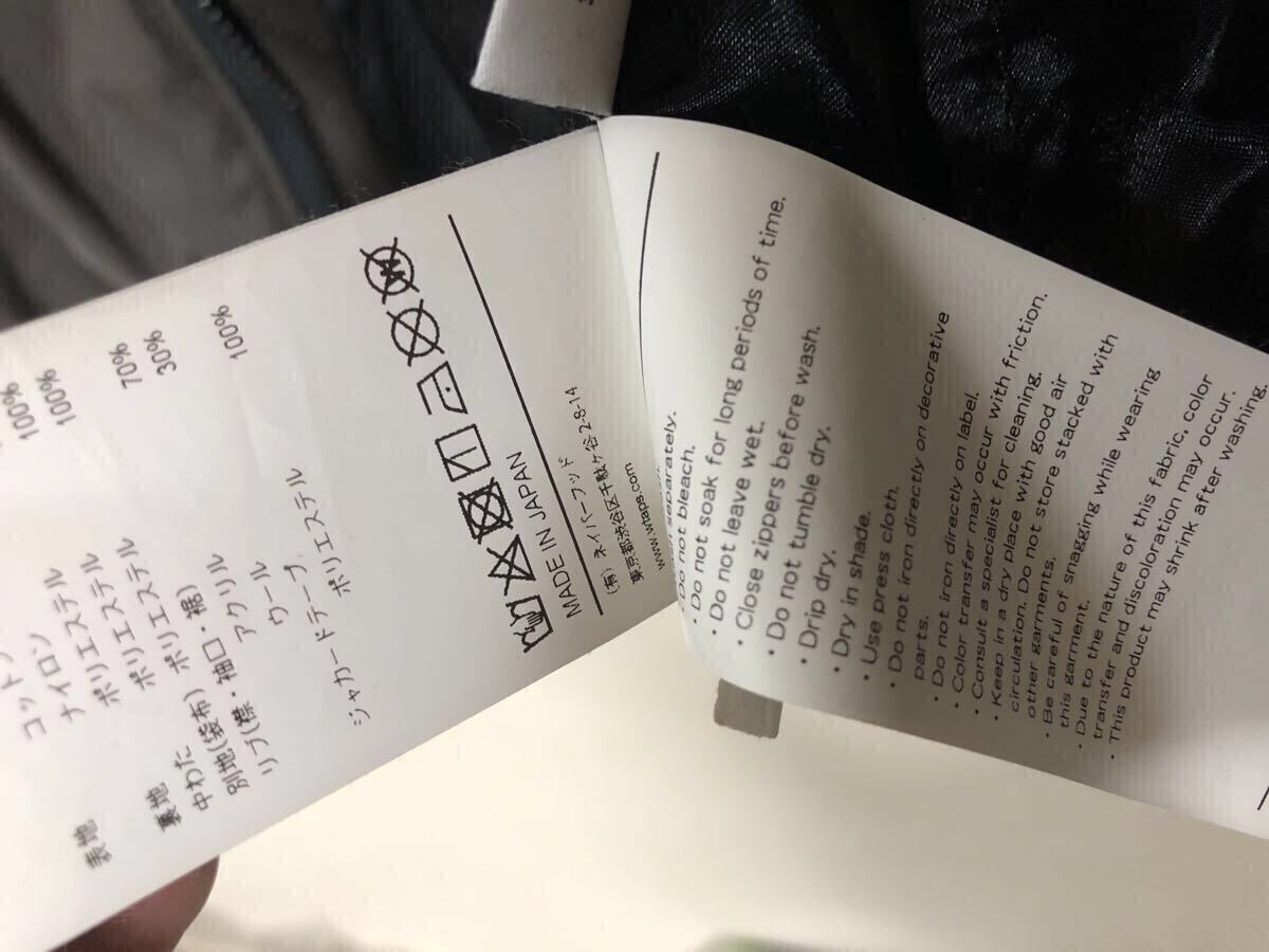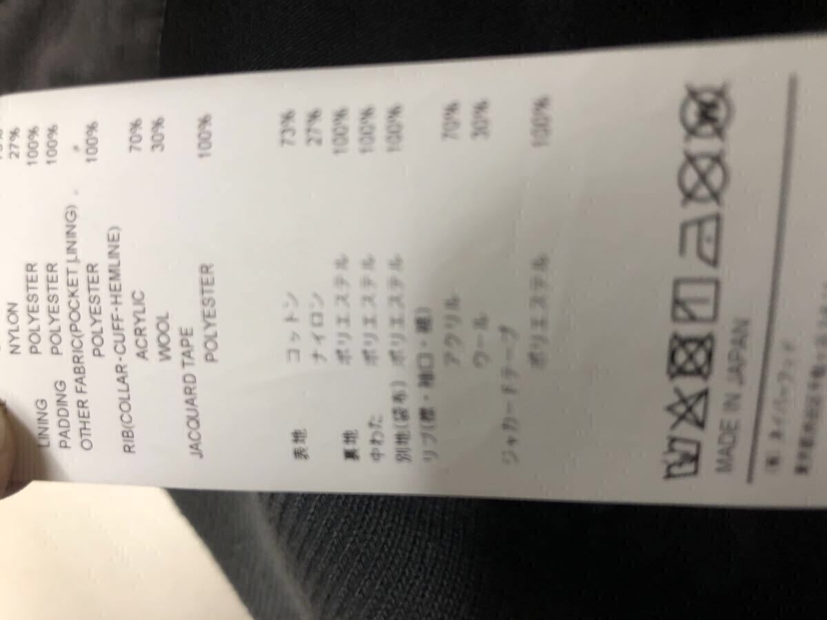 [素材] 表地:コットン 73%、ナイロン 27% 裏地:ポリエステル 100% 中わた:ポリエステル 100% 別地(袋布):ポリエステル 100% リブ(襟・袖口・裾):アクリル 70%、ウール 30% ジャガードテープ:ポリエステル 100%