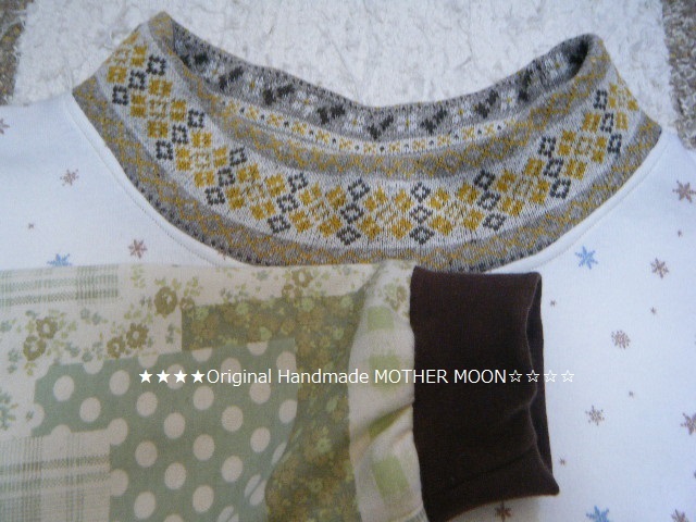 ★雪の結晶柄ニットのチュニック。。。。アーガイル柄のラインとネックニットがかわいい雪の結晶柄のニットチュニックです。。。。肌触りの良いニットをメインに使っています。お袖は薄いグリーンのパッチワーク柄ニットを切り返し、。。。。チュニック丈ですので、スキニーなどと相性ピッタリです。。。。
