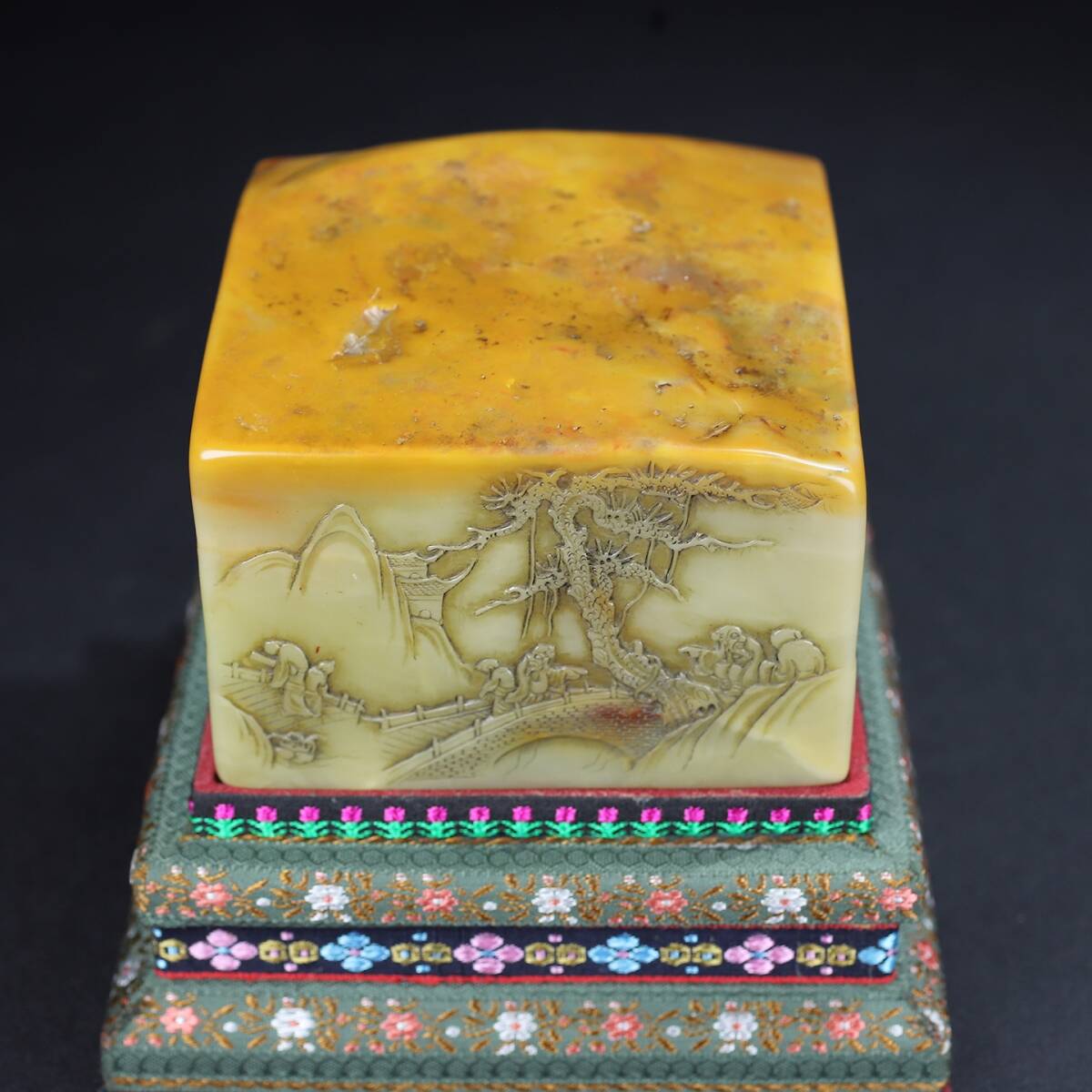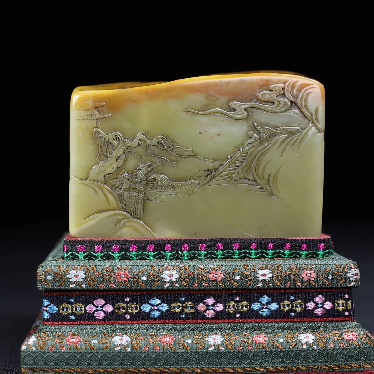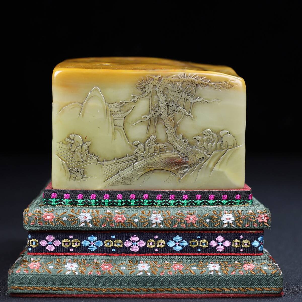 旧蔵 【清代篆刻家 呉熙載】寿山石 彫刻 山水人物物語紋 薄意印鑑 置物 天然石 手彫 篆刻 古印材 極細工 中国古玩 骨董品 古美味 210