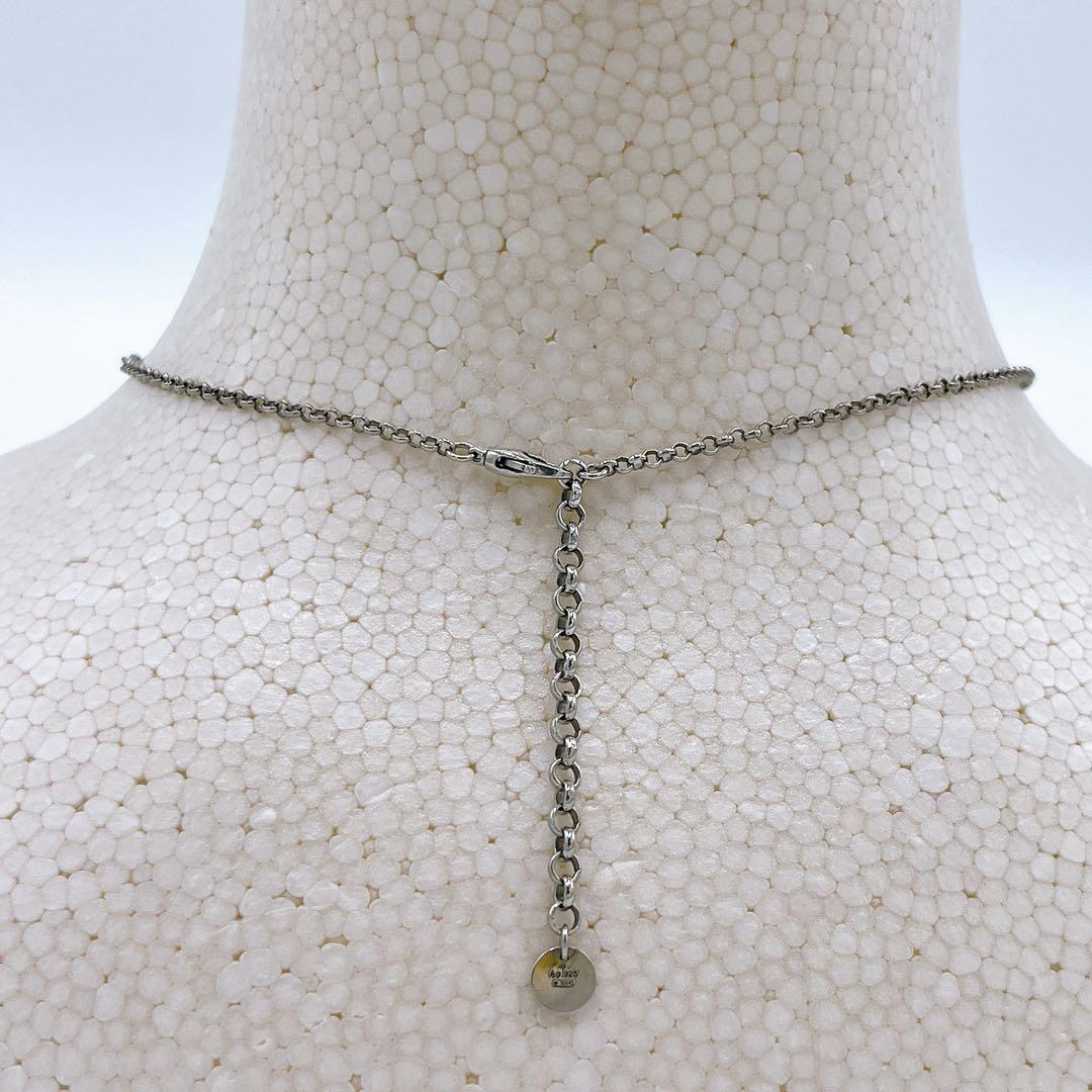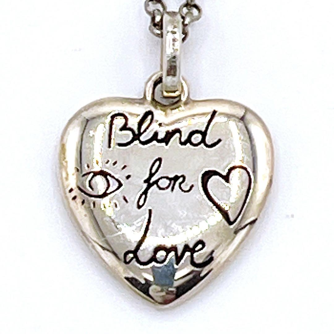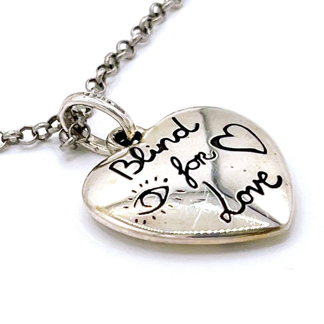 このネックレスは両面使用可能なリバーシブルデザインで、一方に“Blind for Love”(愛は盲目)という刻印があり、もう一方には花や鳥、アイコンとしてのアイとハートのモチーフが刻まれています♪