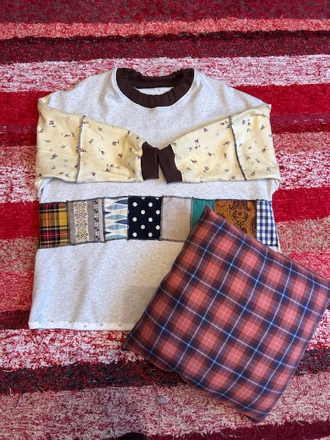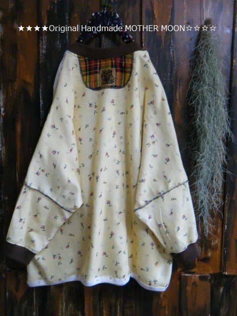 ★胸パッチラインの前後生地違いニットプルOB....表は裏毛杢グレーニット、バッグお花柄のほんわりニットです。。。。お袖はバックの共生地で切り返しました。。。。胸にはパッチワークのラインをポイントに。。。。ネックは茶のリブニットで、細いゴムを入れて少しだけネックをしぼりました。。。。これからの季節に一枚でちょうどよい感じで過ごせます。。。。