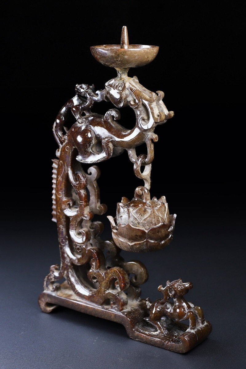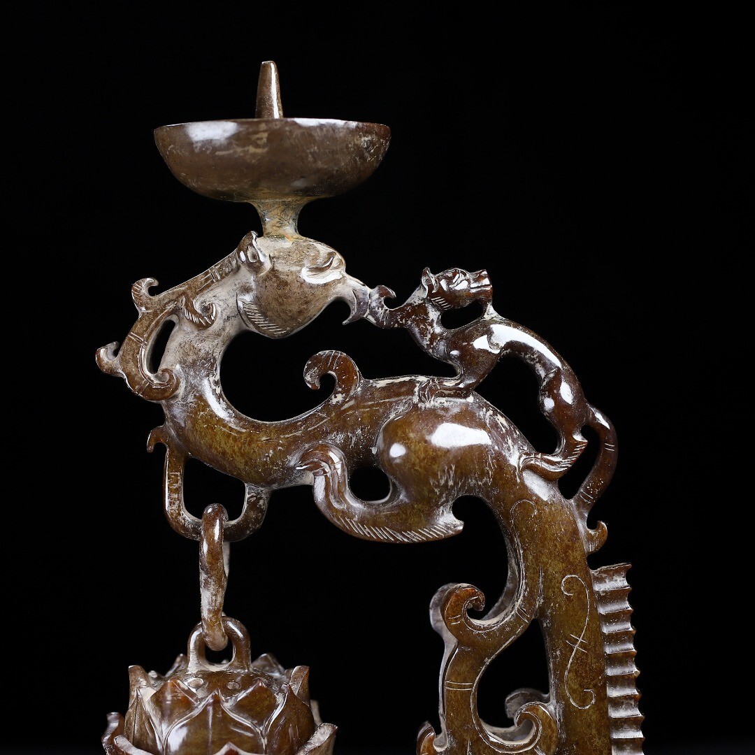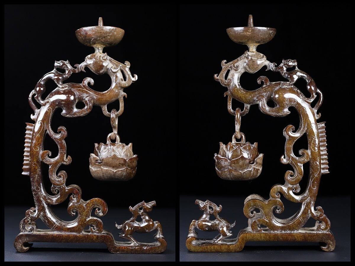 「戦漢時期 和田玉 高古玉彫り 鏈條 龍燈」極細工 擺件 中国古賞物 古美術 旧蔵出