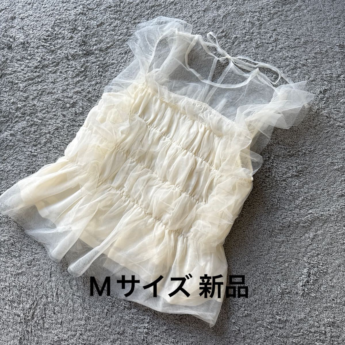 チュールレースシャーリングプルオーバーオフ白です。 未使用ですがタグはついていません。 襟ネームと品質ネームの一部が切り取られています。 自宅保存なので細かい事を気になさる方は ご入札を避けて下さいね♪ サイズはMサイズです。 平置きで身幅41センチ 着丈59センチ 素人なので多少の差はご了承ください。 品質はチュール ナイロン100% 別布 ポリエステル100%です。 実際のお色と画像は光の具合により 多少異なる場合があります。 | |||