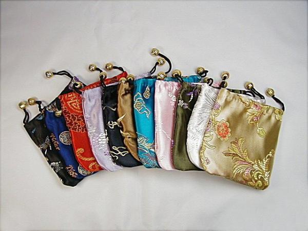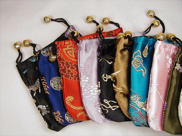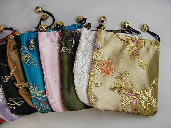 この種の巾着の外側生地は、シルク製で、たいへん綺麗な刺繍が施されております。内側は、ナイロン生地製、中央には、純綿製の敷層があります。製作は、全てが手工芸によるものです!