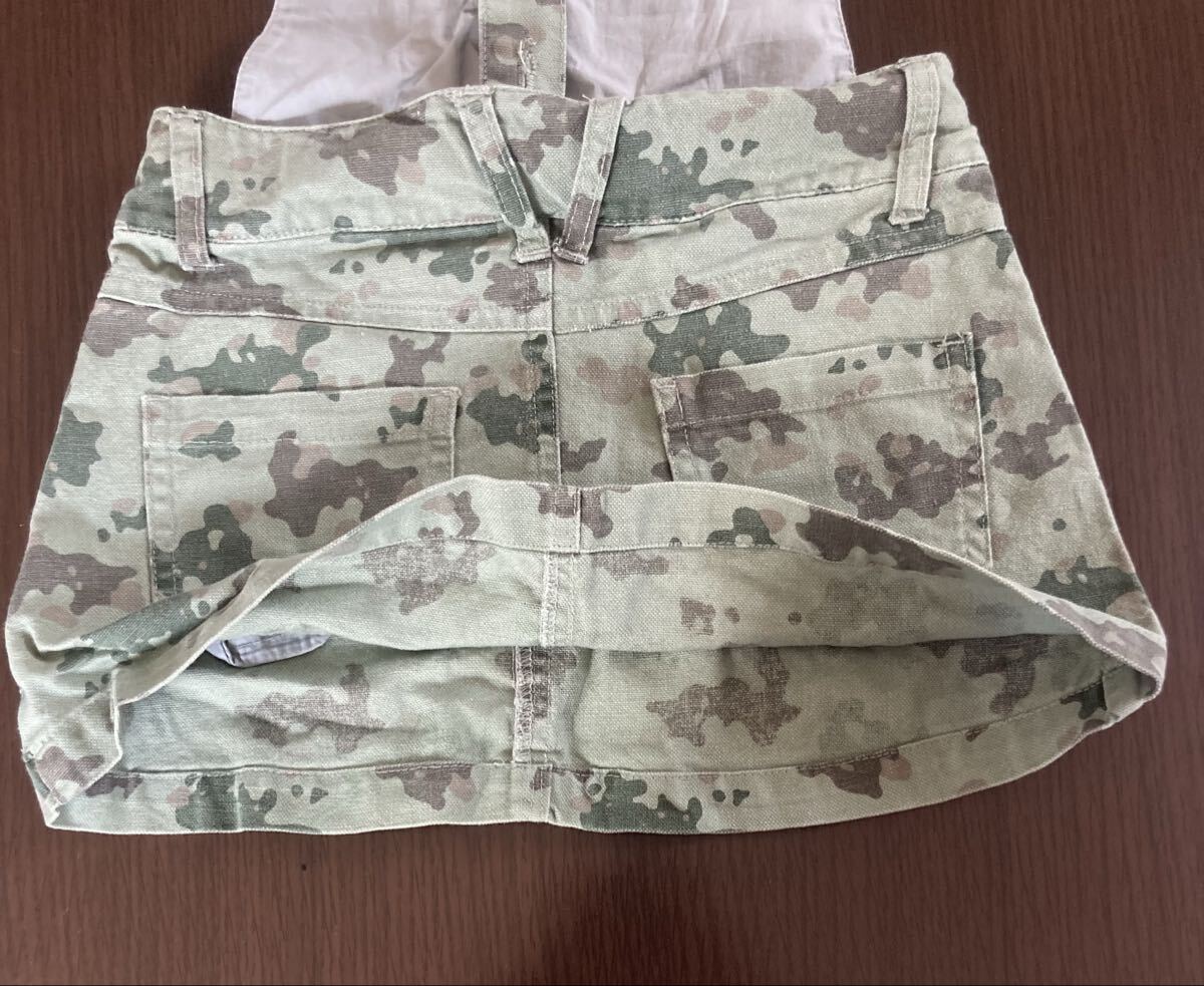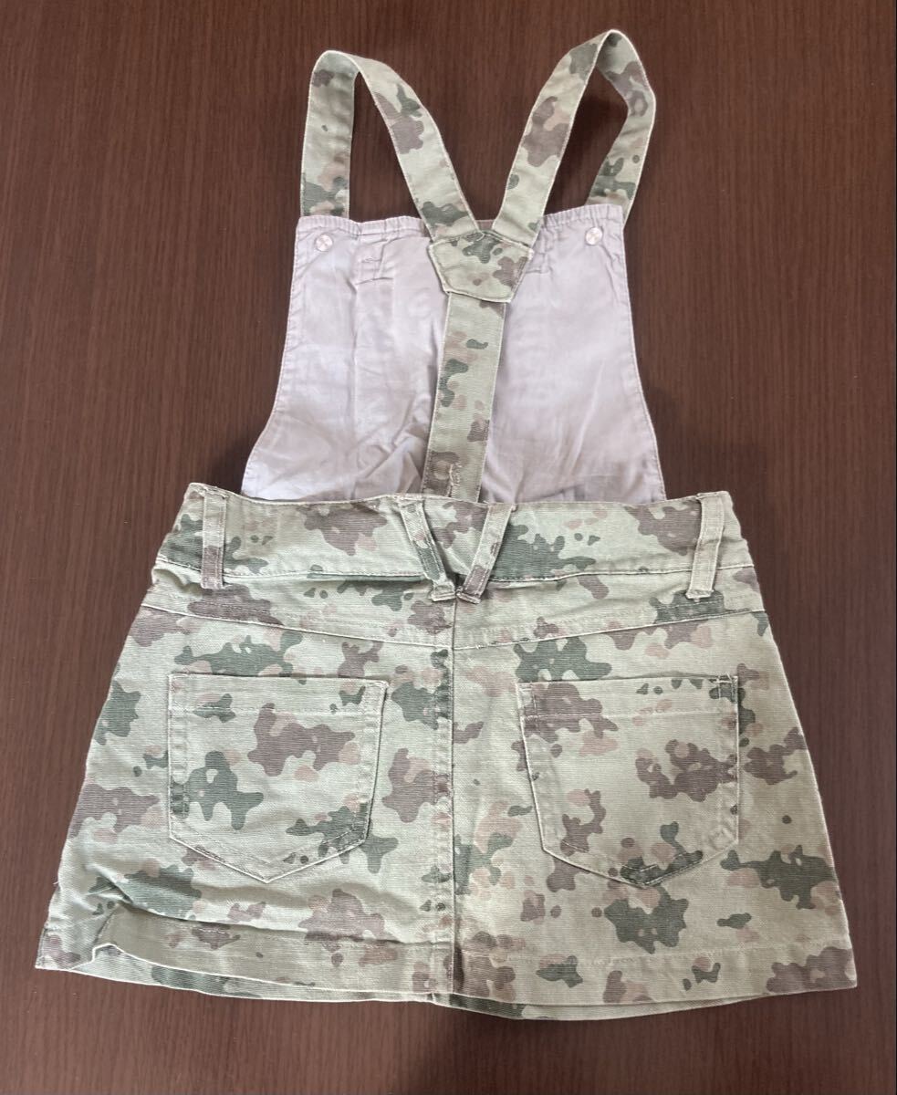 迷彩柄のオーバーオール胸と前2つ後ろ2つポケットがあります。