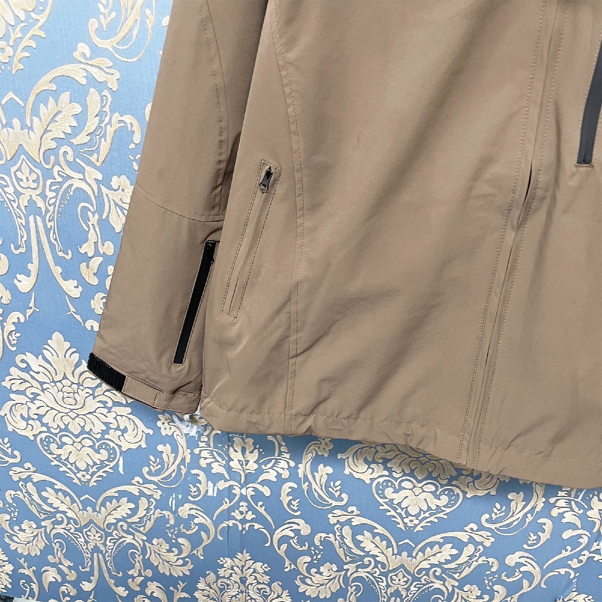 左胸には刺繍がデザインされ、おしゃれな雰囲気を醸し出します。ZIPを閉めるとしっかり立つハイネック、首元までしっかり覆い冷たい風の侵入も防ぎます。また、袖口には調整可能なマジックテープが施されており、風の侵入を防ぎながらぴったりとフィットさせることができます。フード(取り外し不可)と裾がドローコード付き、絞り込むことで防寒性を高めることが可能。胸元、右袖やサイドには便利なジッパーポケットがあり、スマートフォンや鍵などの小物を安全に収納可能です。