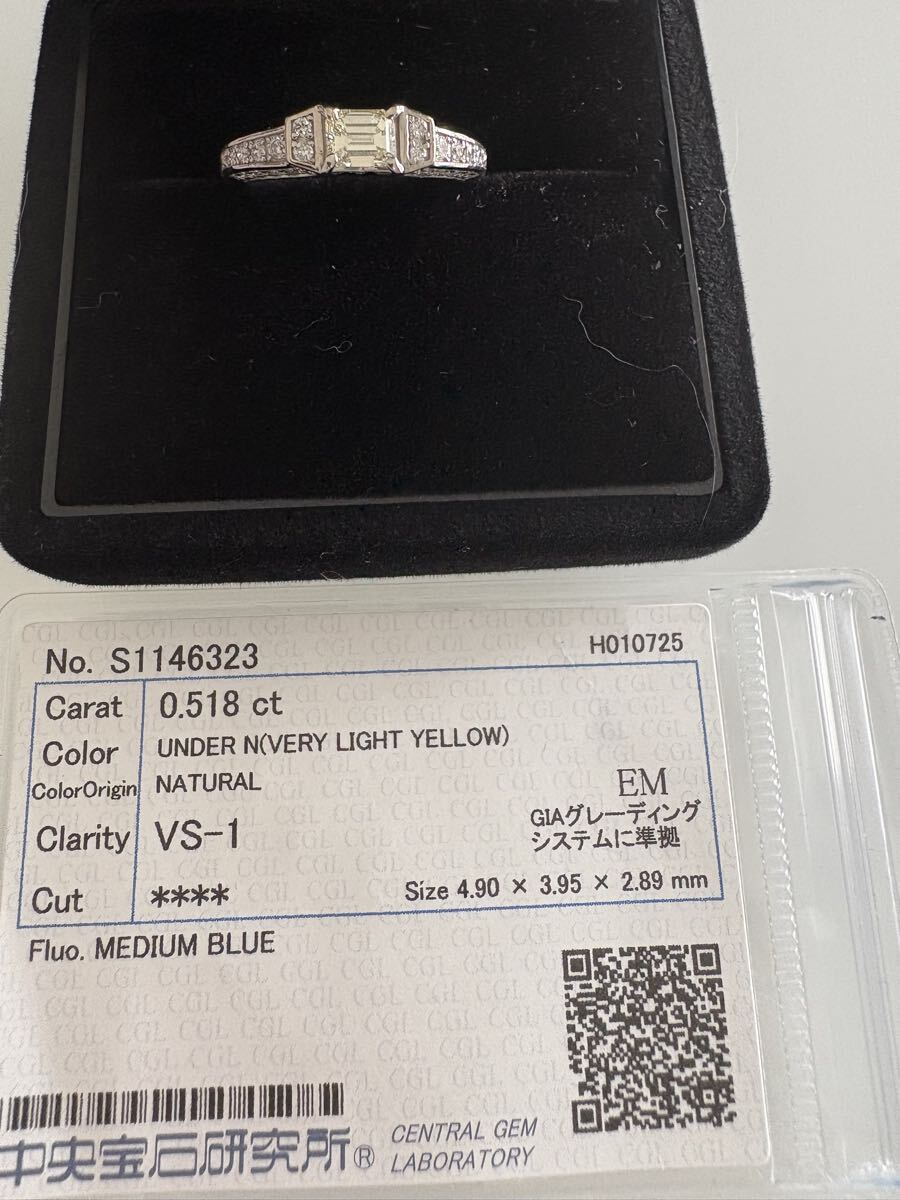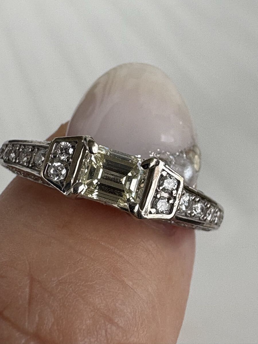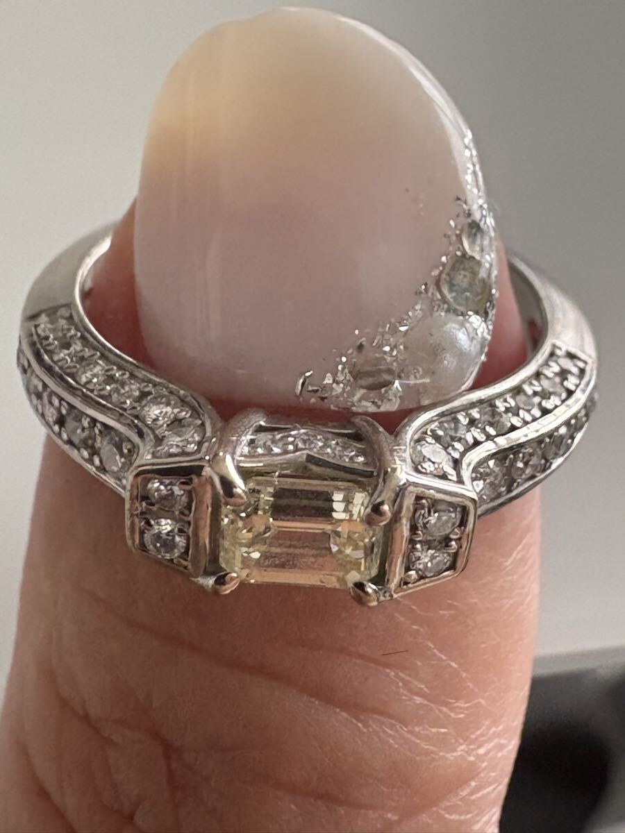 ホワイトゴールド素材に、中石0.518ctのライトイエローVS1の周り全体どこを見てもダイヤ0.41ctの品のあるゴージャスリングです