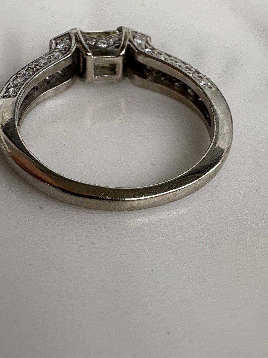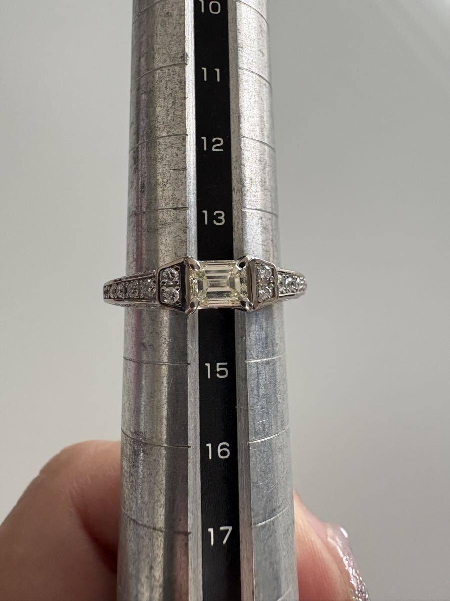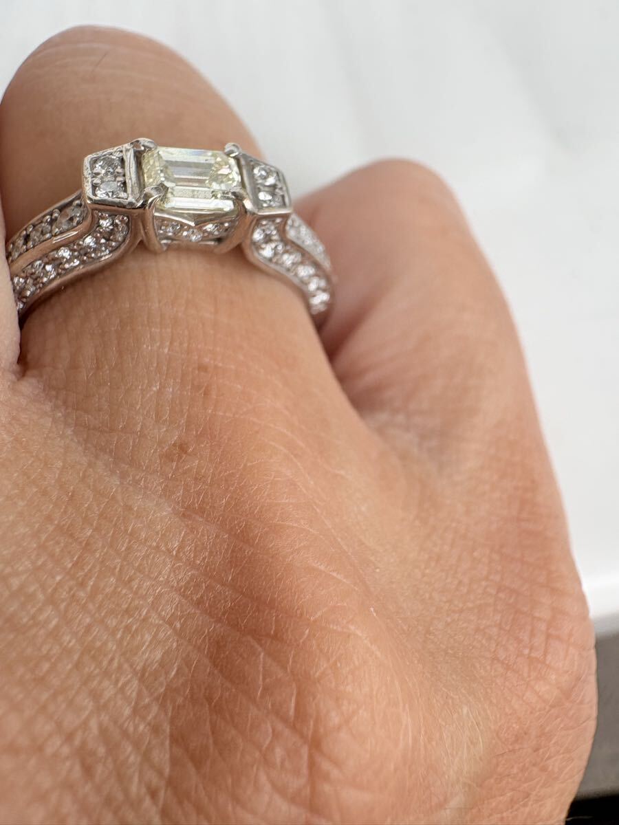 ホワイトゴールド素材に、中石0.518ctのライトイエローVS1の周り全体どこを見てもダイヤ0.41ctの品のあるゴージャスリングです