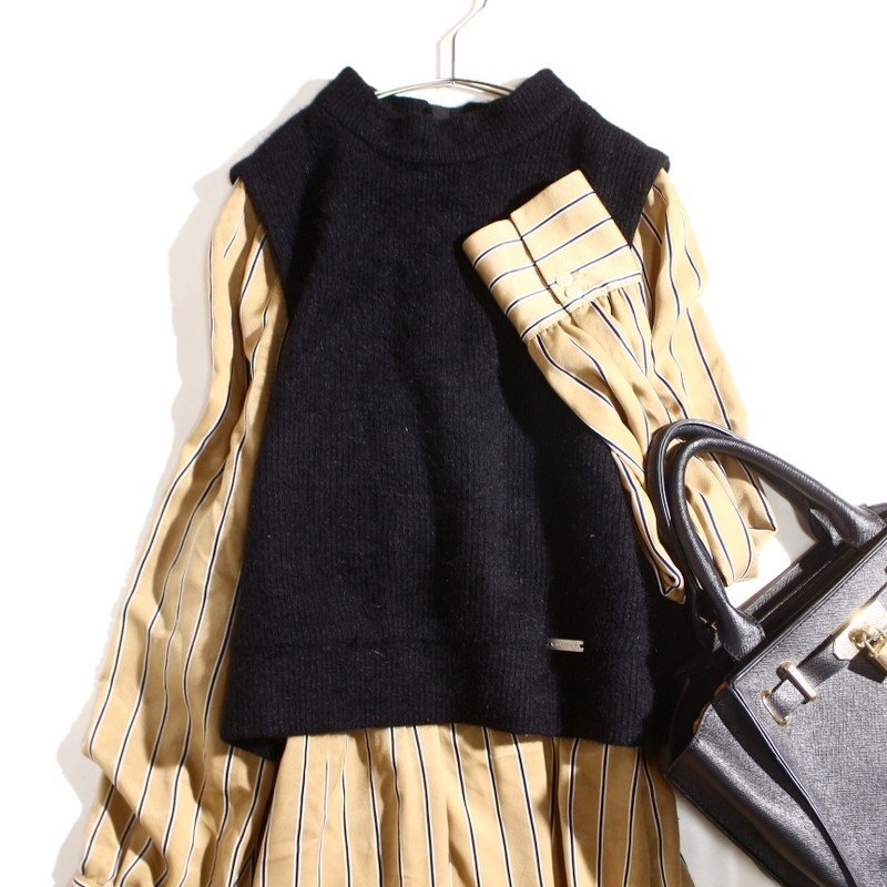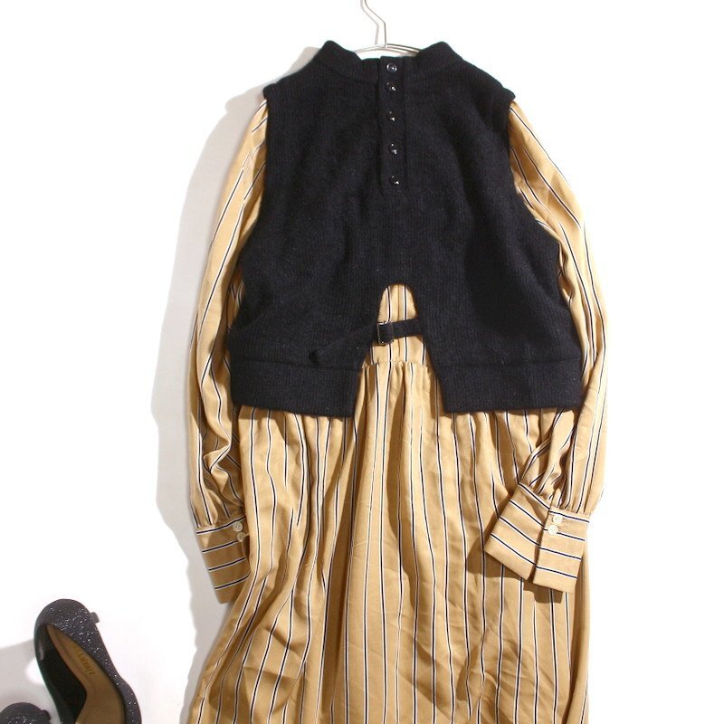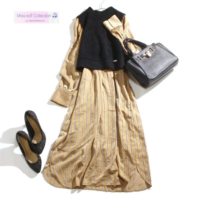 美品 Miss edi Collection ミスエディコレクション 株) ジオ商事 秋 合い物 ストライプ 柄 ウール ドッキング ロングワンピース 9号 38 黒