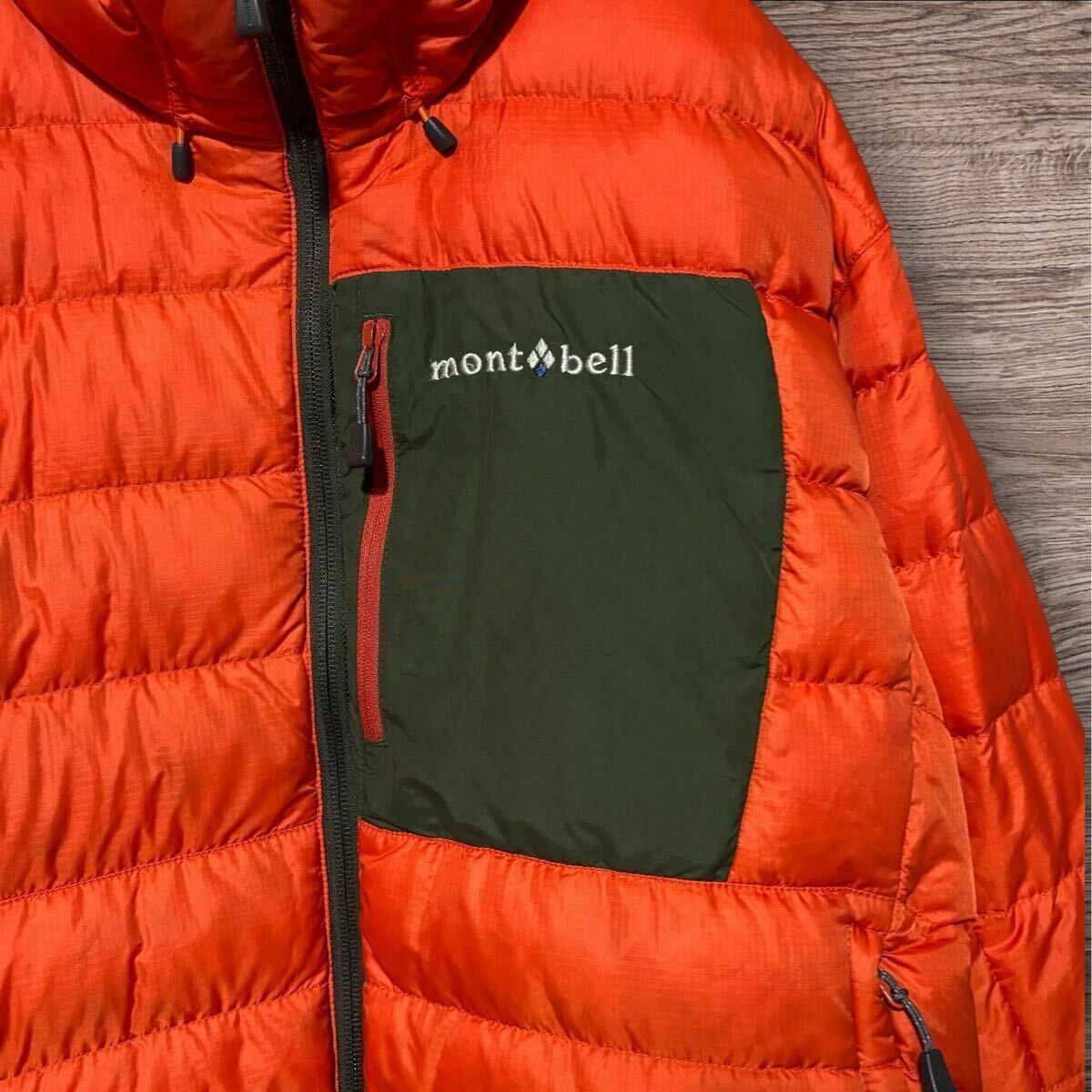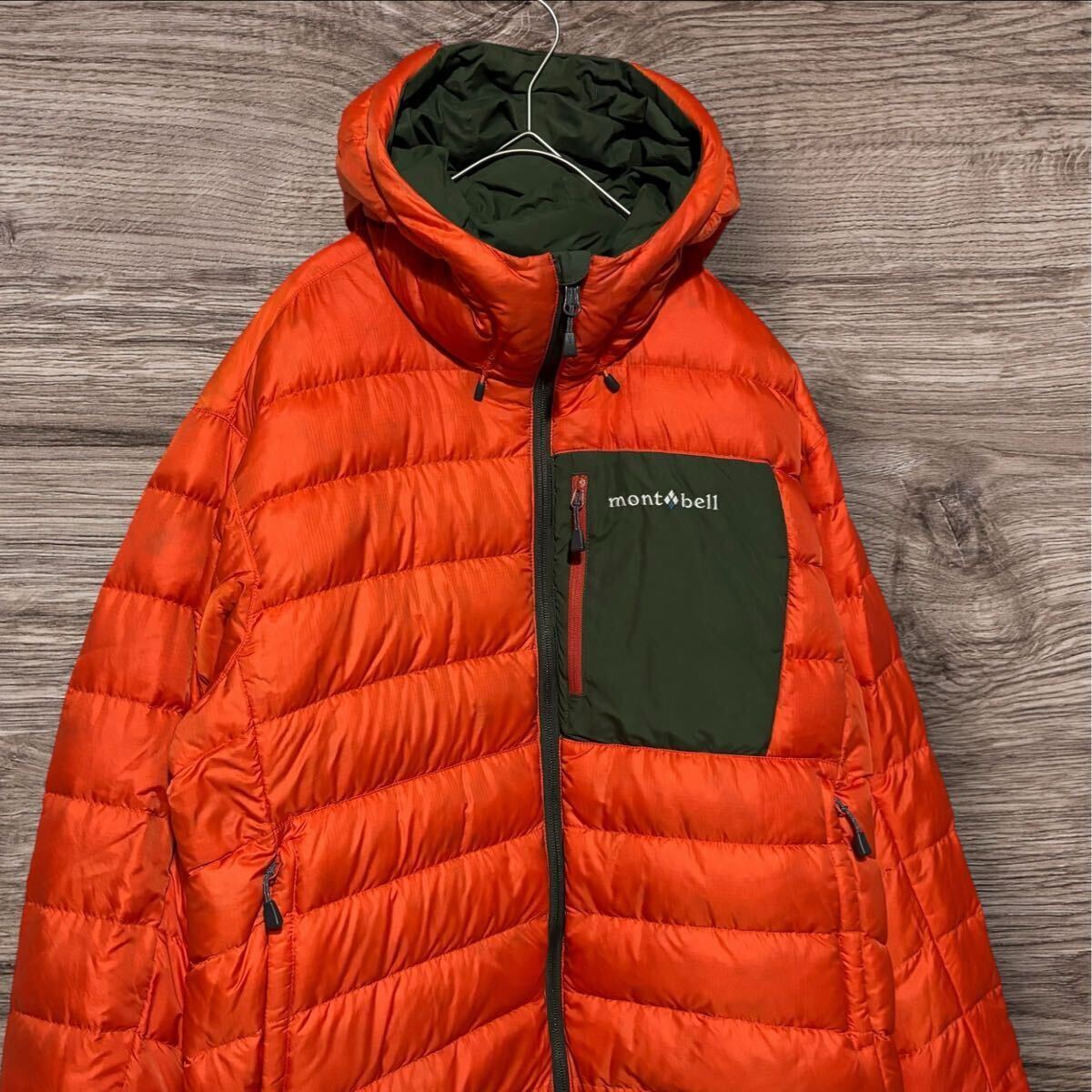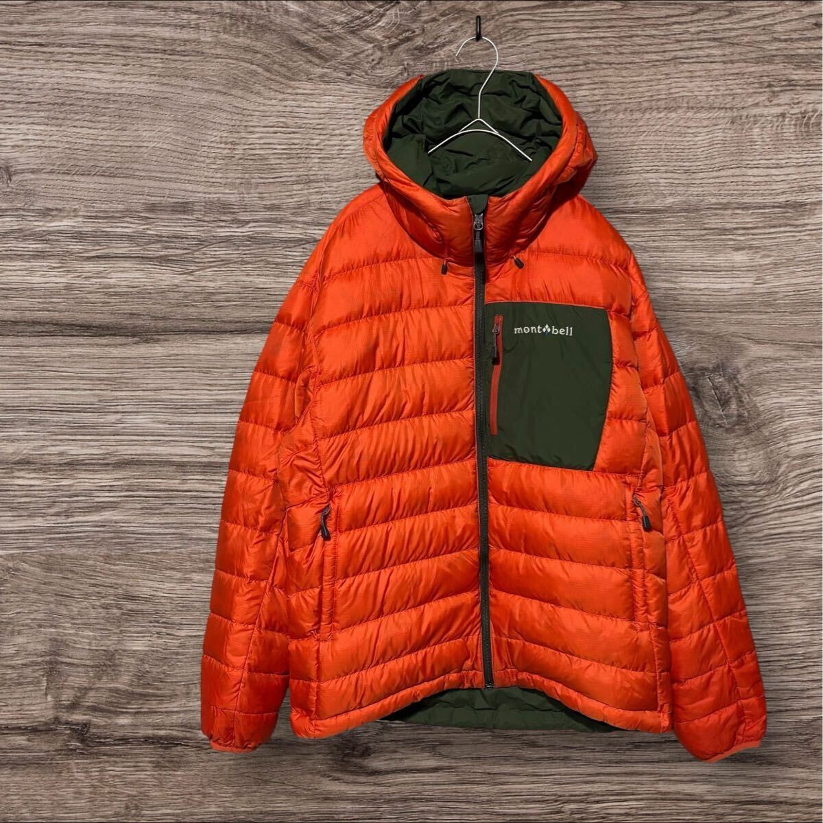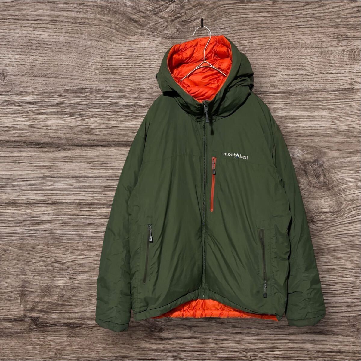 オレンジとグリーンの配色が特徴のmontbell製フード付きダウンジャケット。