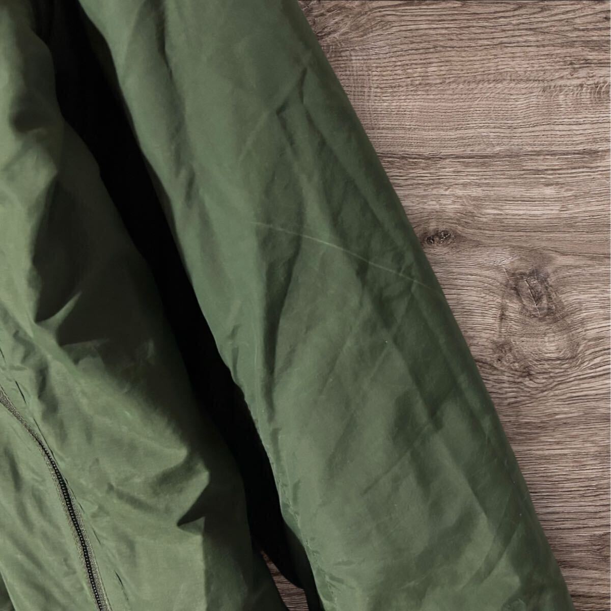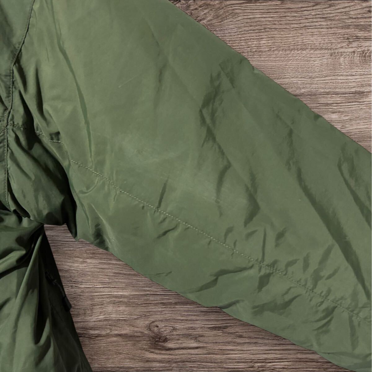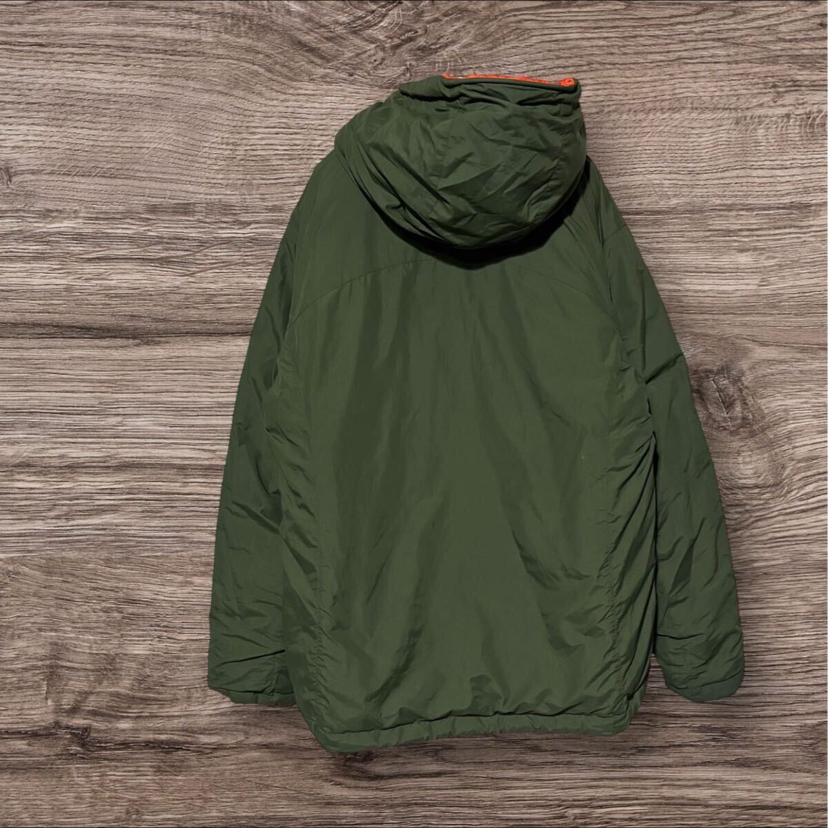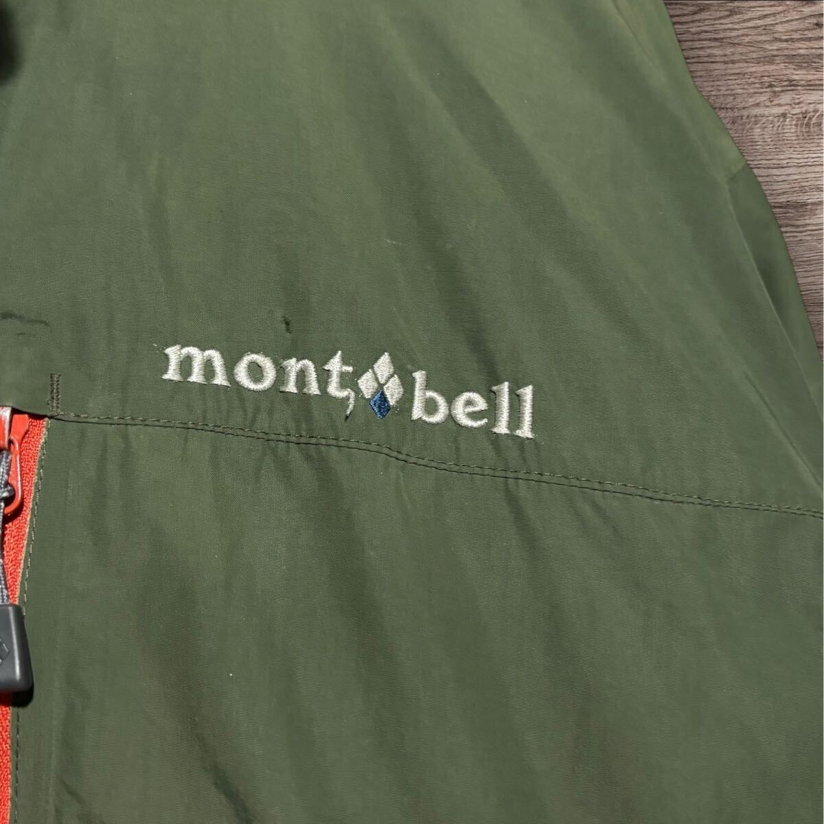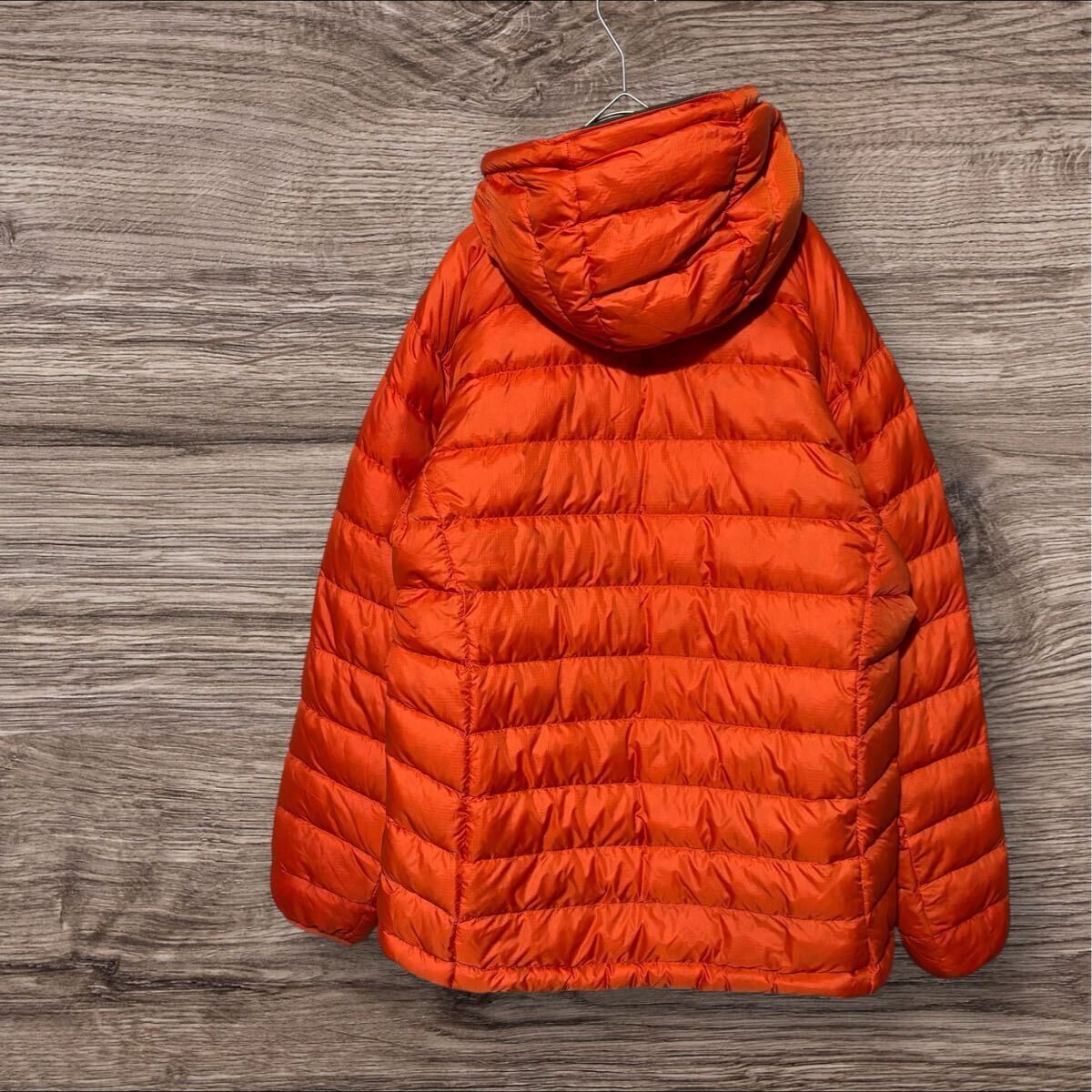 オレンジとグリーンの配色が特徴のmontbell製フード付きダウンジャケット。