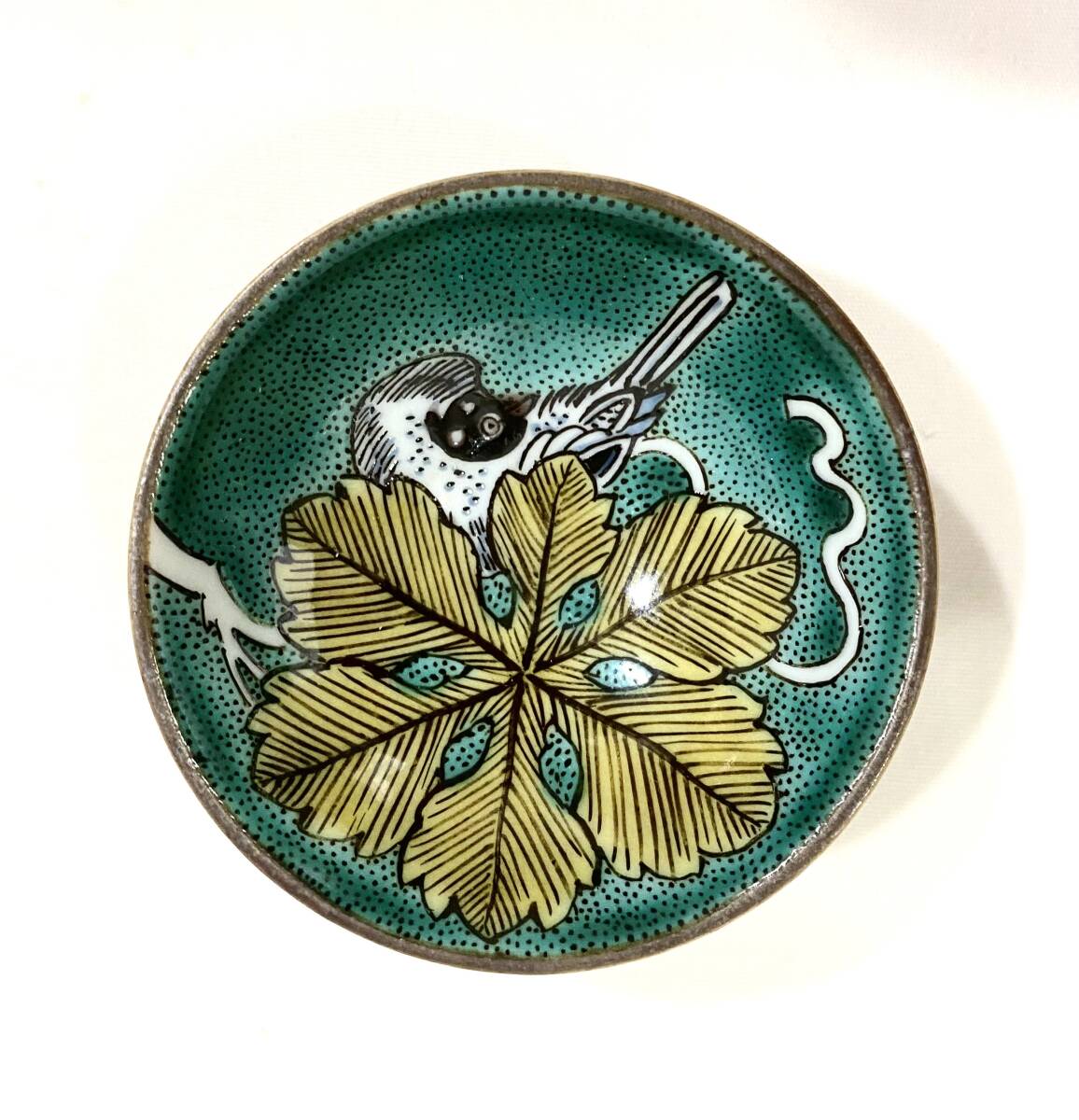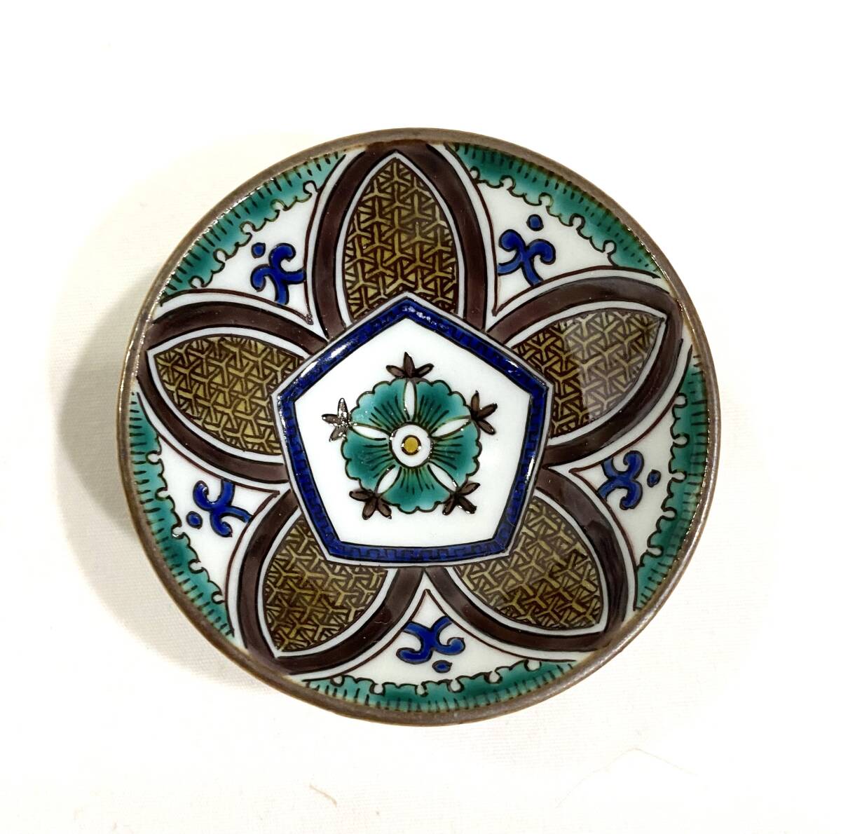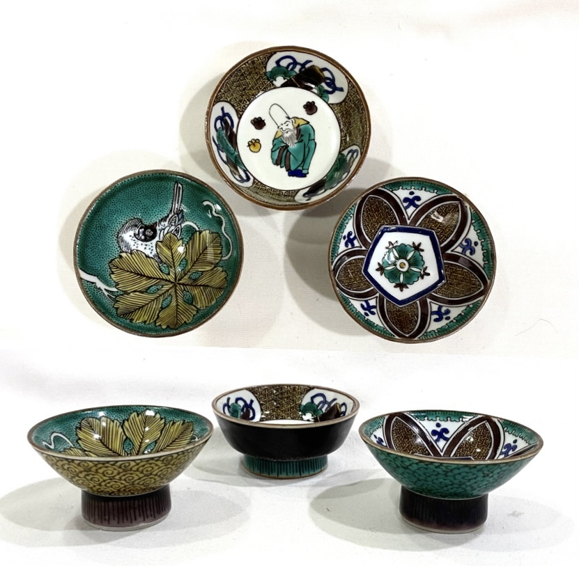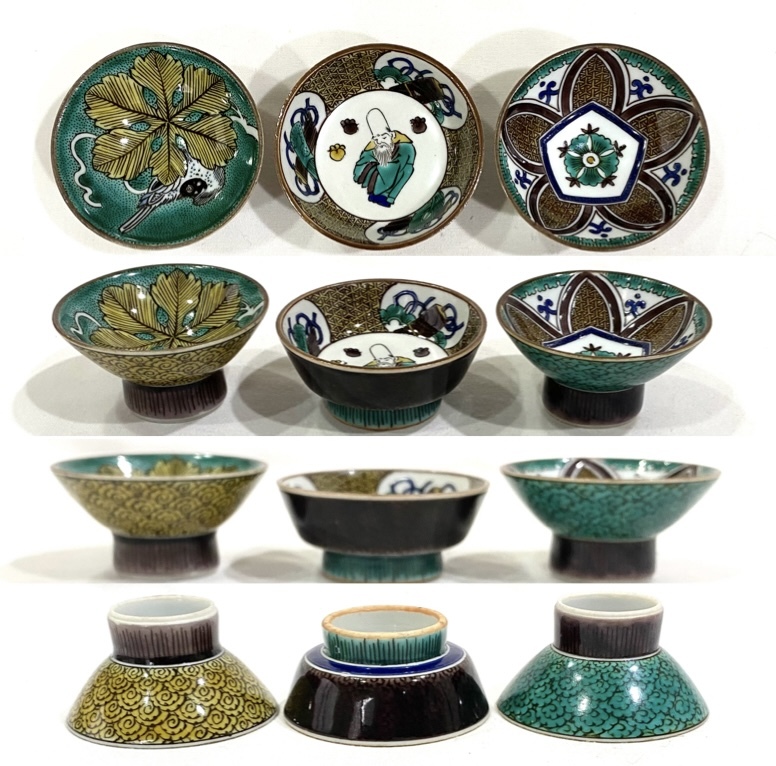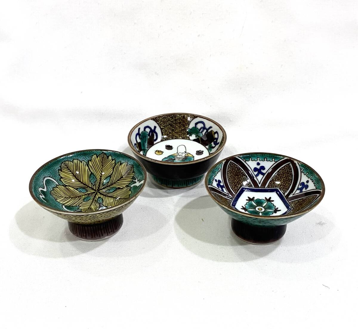 二代 徳田八十吉 ”色絵猪口” 種々3個です。それぞれ図柄の異なる3個の猪口(酒盃、酒杯)で、古九谷を思わせる独特な筆致と色彩に重厚な趣が感じられ魅力があります。 二代 徳田八十吉(1907年〜1997年)1907年 石川県生まれ、 1923年 初代徳田八十吉の養子となり師事 、1938年 富本憲吉に師事 、1951年 日展で特選および朝倉賞を受賞 、1956年 二代目徳田八十吉を襲名 九谷焼の近代化を推進 、1958年 ブリュッセル万国博覧会でグランプリを受賞 1976年 石川県九谷陶磁器商工業協同組合連合会の 相談役・名誉理事に就任、 1982年 九谷焼技術保存会会長に就任、 1988年 八十吉の名を長男に譲り 百々吉を名乗る 。少し古いものですが、保存状態の良い綺麗なものです。九谷焼 二代 徳田八十吉 ”色絵猪口” 種々3個本が楽しめます。口外径約6.5㎝、高さ約3.0~3.4㎝。