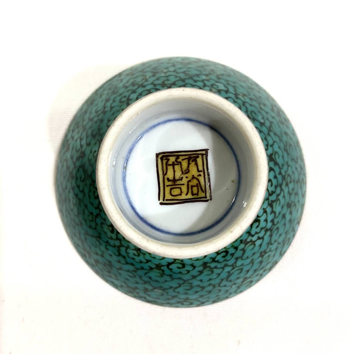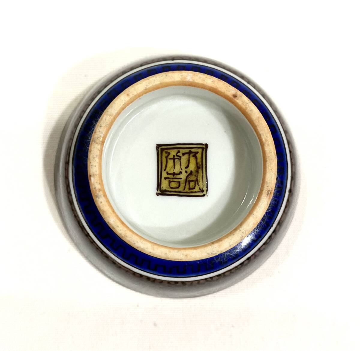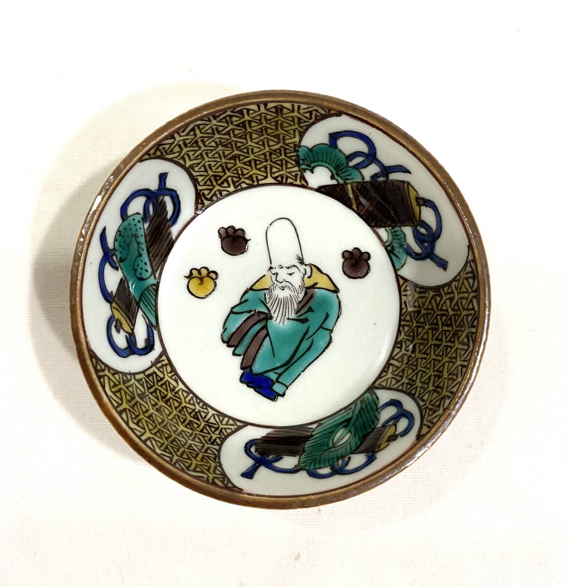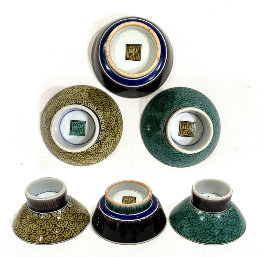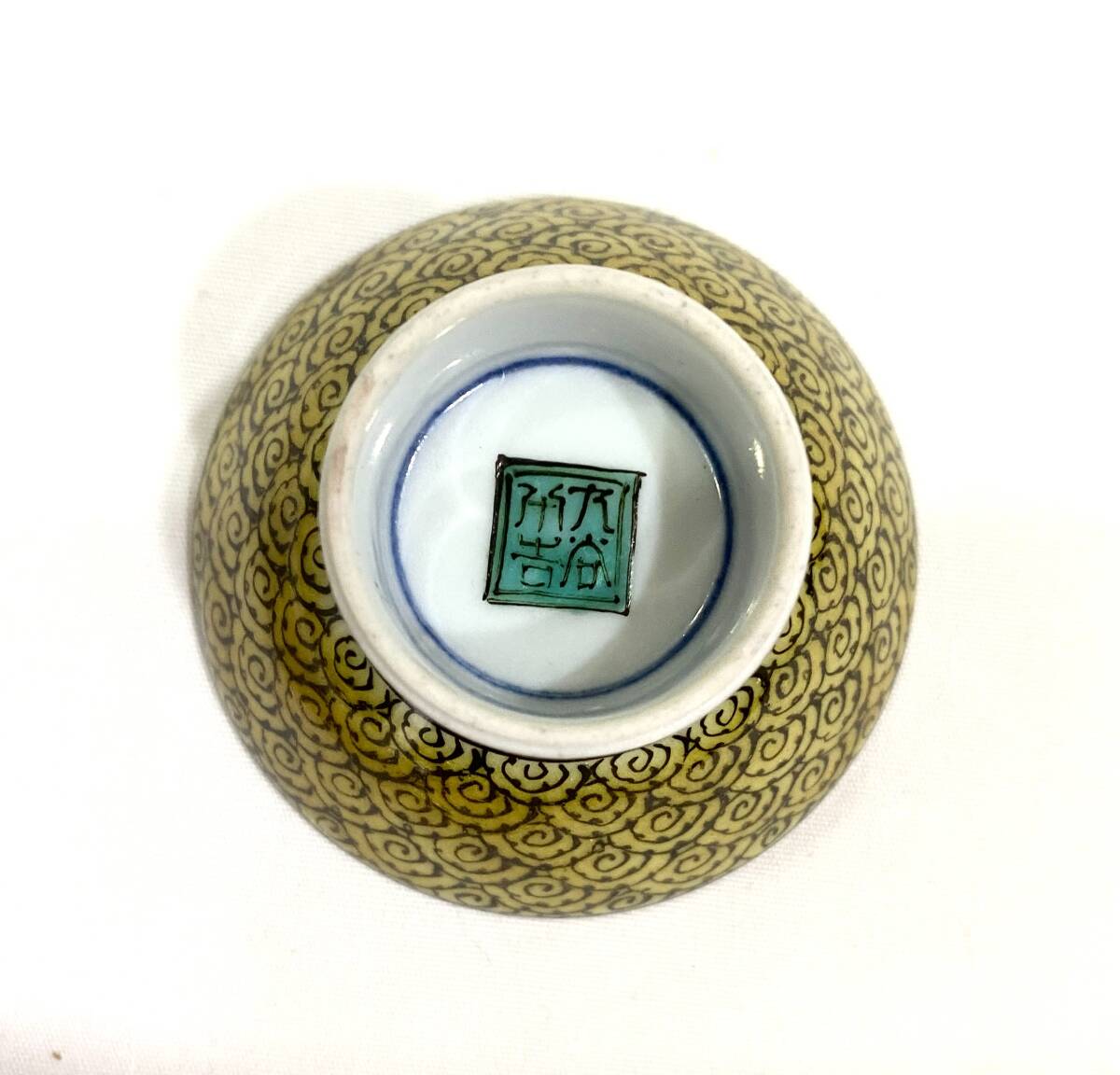 二代 徳田八十吉 ”色絵猪口” 種々3個です。それぞれ図柄の異なる3個の猪口(酒盃、酒杯)で、古九谷を思わせる独特な筆致と色彩に重厚な趣が感じられ魅力があります。 二代 徳田八十吉(1907年〜1997年)1907年 石川県生まれ、 1923年 初代徳田八十吉の養子となり師事 、1938年 富本憲吉に師事 、1951年 日展で特選および朝倉賞を受賞 、1956年 二代目徳田八十吉を襲名 九谷焼の近代化を推進 、1958年 ブリュッセル万国博覧会でグランプリを受賞 1976年 石川県九谷陶磁器商工業協同組合連合会の 相談役・名誉理事に就任、 1982年 九谷焼技術保存会会長に就任、 1988年 八十吉の名を長男に譲り 百々吉を名乗る 。少し古いものですが、保存状態の良い綺麗なものです。九谷焼 二代 徳田八十吉 ”色絵猪口” 種々3個本が楽しめます。口外径約6.5㎝、高さ約3.0~3.4㎝。
