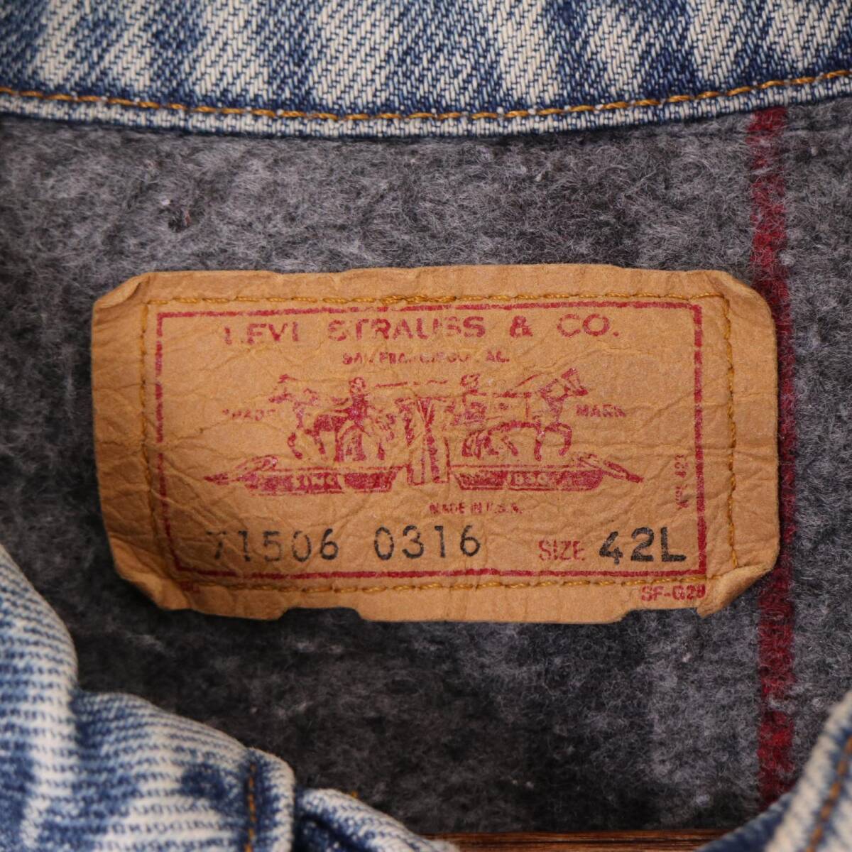 【商品管理番号】 A1191 【ブランド】 Levi's/リーバイス 【サイズ】 42 【実寸サイズ】 肩幅:約48cm 着丈:約60cm 身幅:約55cm 袖丈:約63.5cm 【主な素材】 表地 : コットン 裏地 : 13897 【色】 ブルー 【仕様】 生産国 : USA製 90年代 71506-0316 【状態】 特記事項: 全体的に使用感がございます。着用に問題はございません。 |