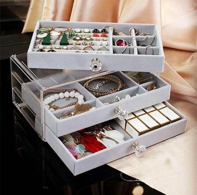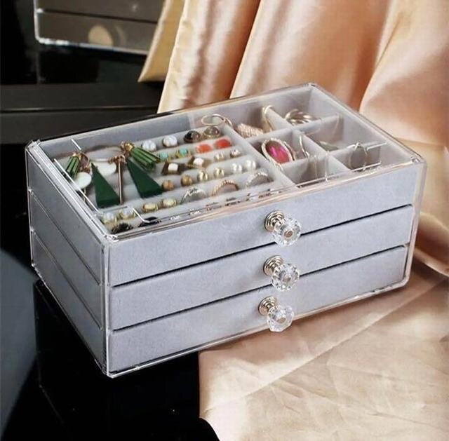 透明のアクリルケースに、 グレーのベロア系素材で上品な雰囲気です。 ルビー、ダイヤモンド等の リング、ピアス、イヤリング、ネックレス等の 収納にいかがでしょうか。