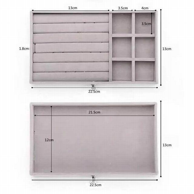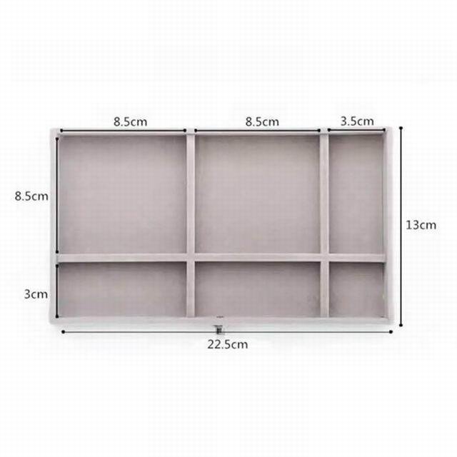 1段めはリングホルダー等がありたくさん収納できます。 2段めはフリースペースにネックレスやブレスレットを小分けに収納できます。 3段めは仕分けがないタイプなので腕時計なども収納しやすいと思います。 全体のサイズは24㎝×14㎝×高さ約11cmです。