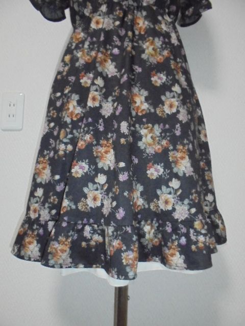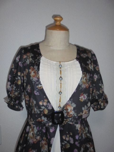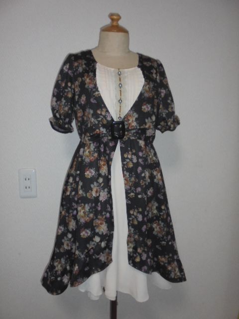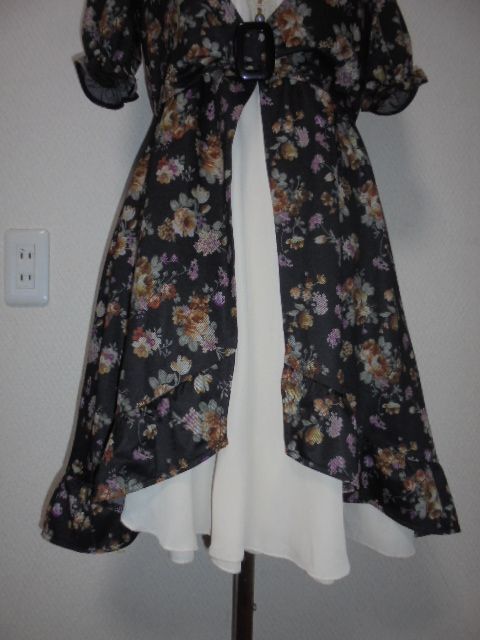 axes femme焦げ茶花柄胸下バックルモチーフ2枚重ね風OP