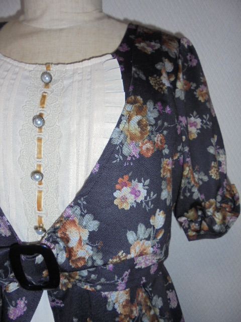 胸元部、別布切替になりベロアテープにボタンとレース、