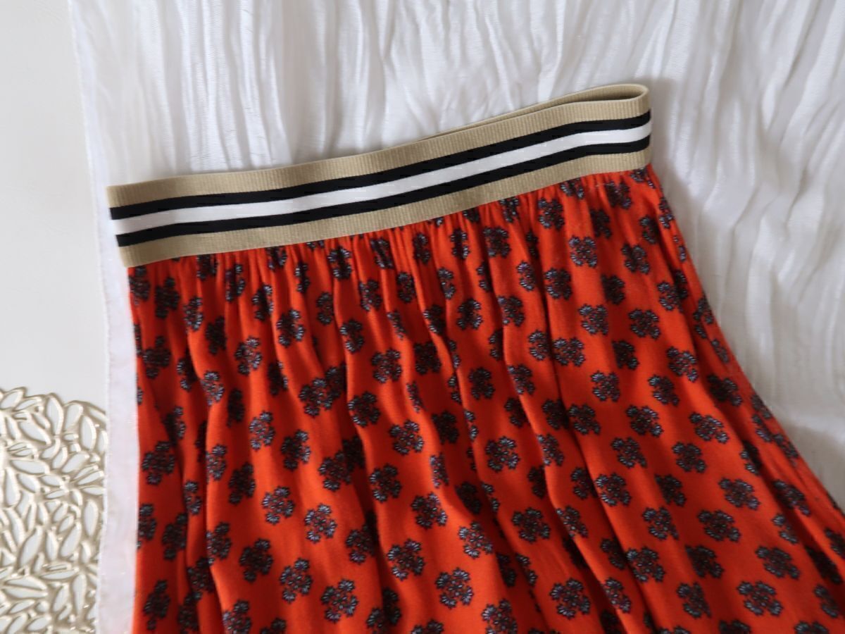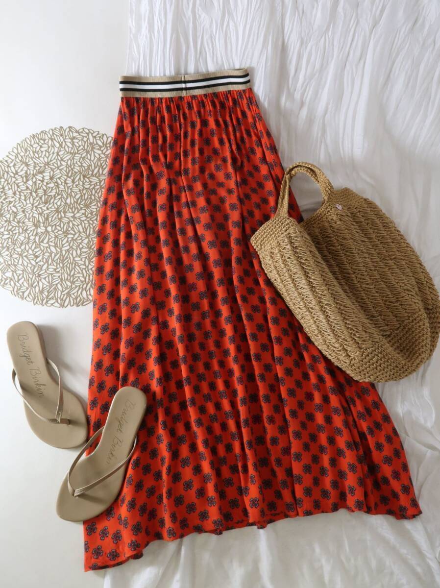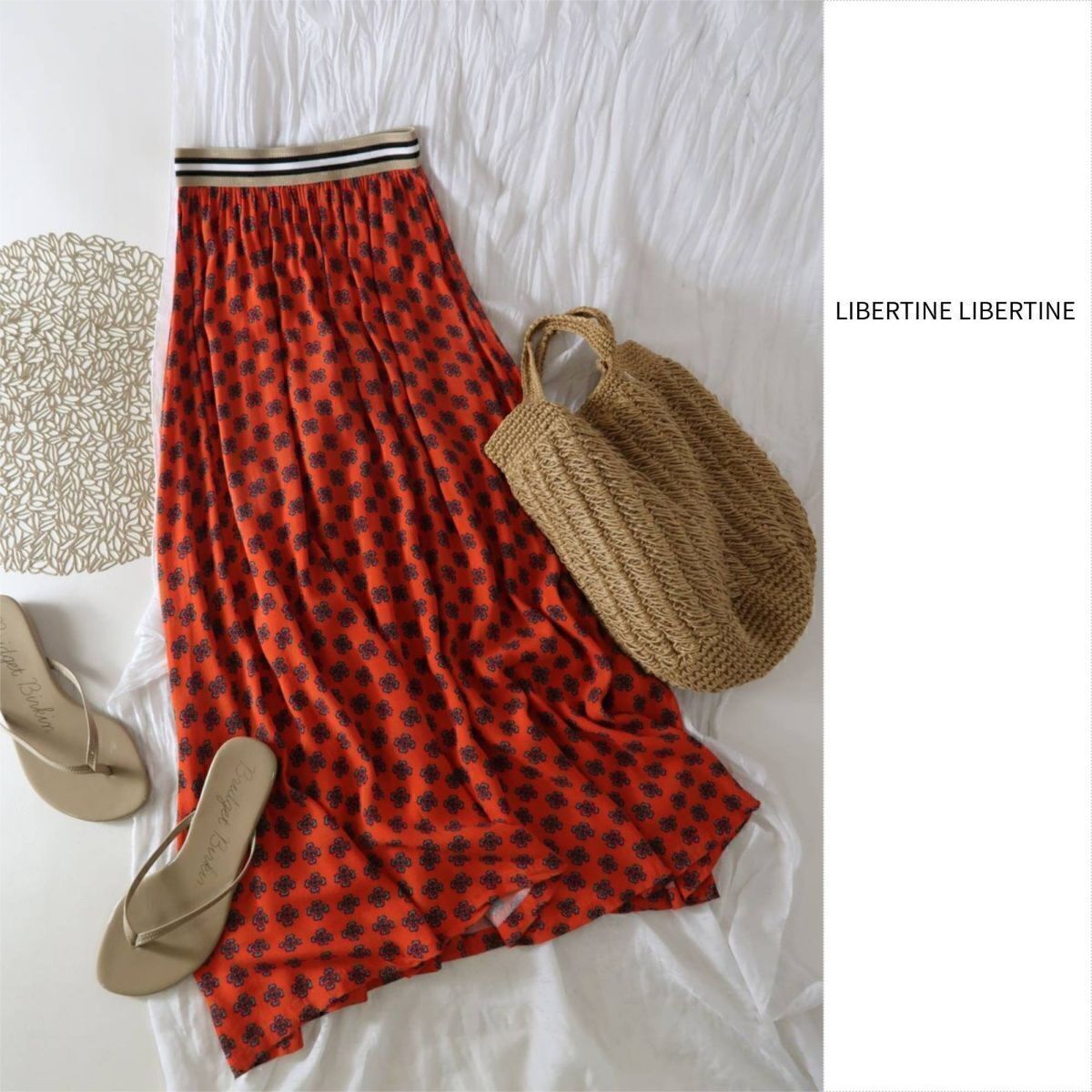 レトロな雰囲気漂うプリント柄が目を引くロングスカート。落ち感のある素材が生み出すフレアラインが、大人の女性らしいルックスを叶えます。スポーティーな印象のゴムウエストは、リラックスした履き心地に加え、さり気ないモード感をプラス。