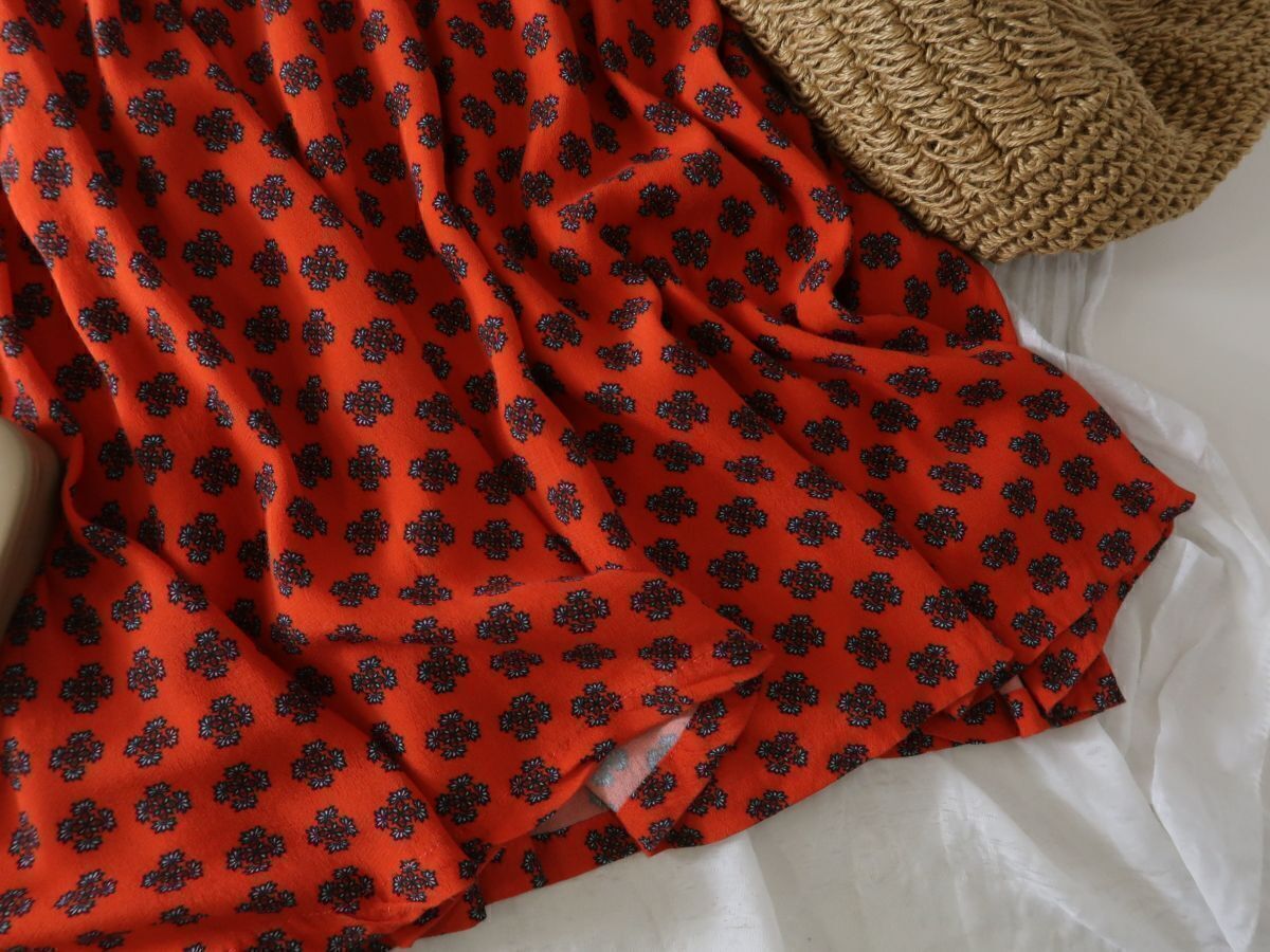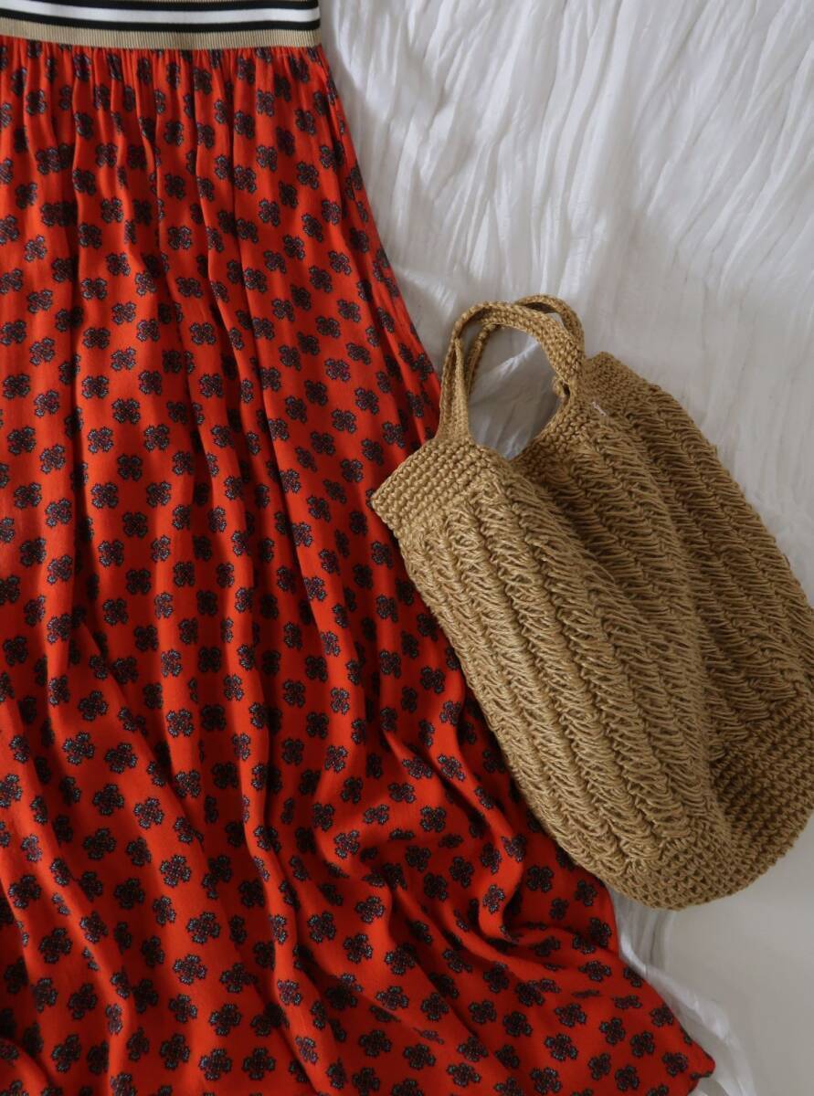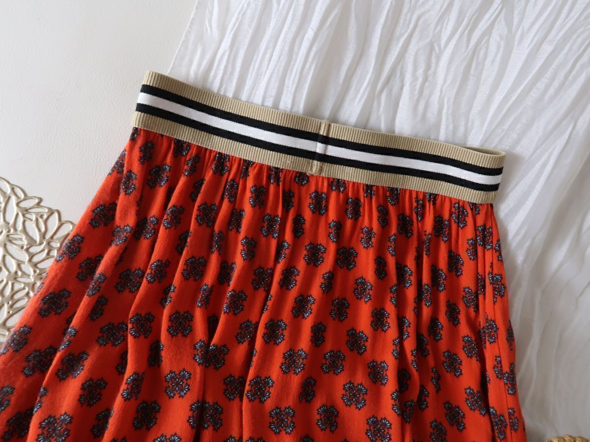 レトロな雰囲気漂うプリント柄が目を引くロングスカート。落ち感のある素材が生み出すフレアラインが、大人の女性らしいルックスを叶えます。スポーティーな印象のゴムウエストは、リラックスした履き心地に加え、さり気ないモード感をプラス。