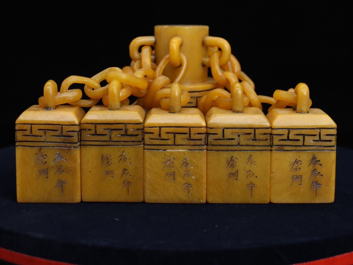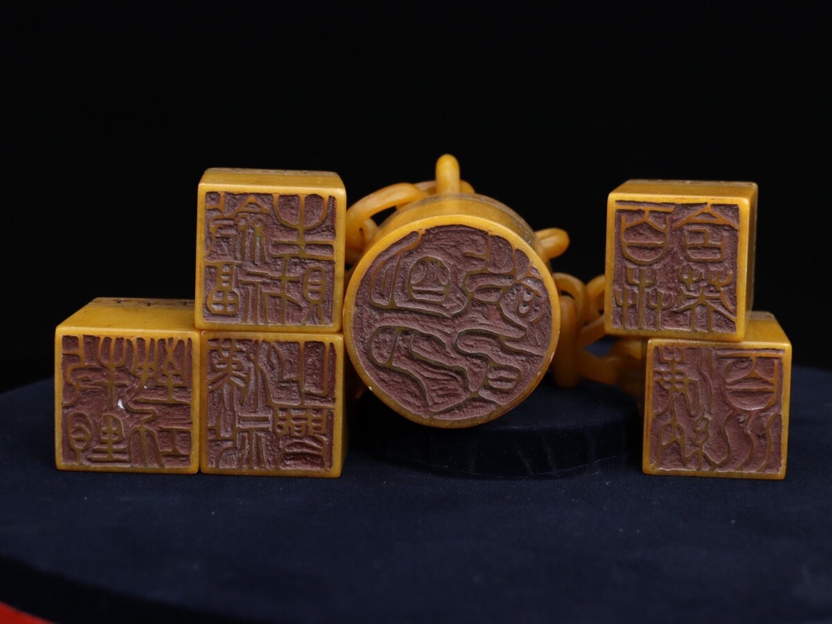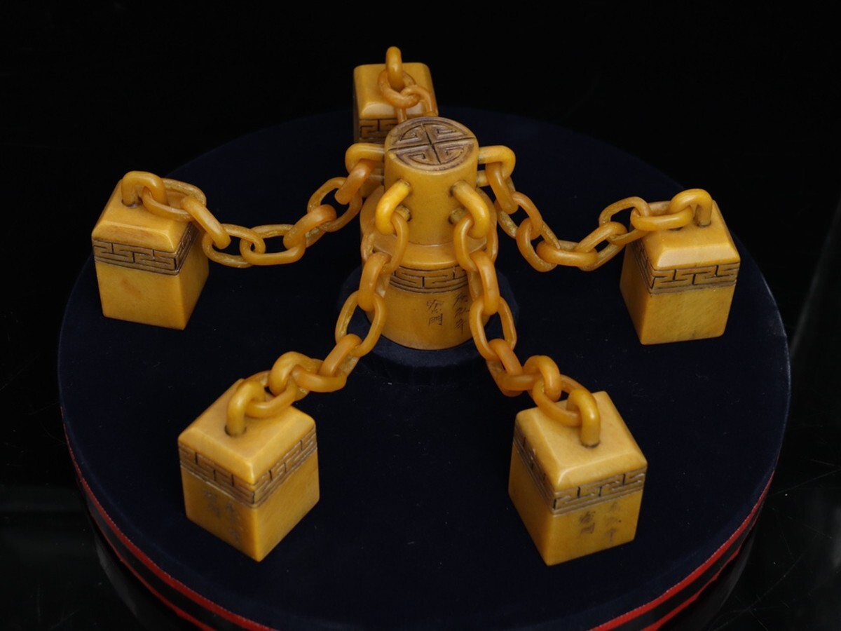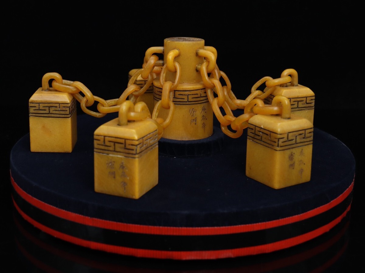 「清 滄門 老寿山石 田黄石彫り 六鏈印章」極細工 擺件 古賞物 中国古美術 旧蔵出
