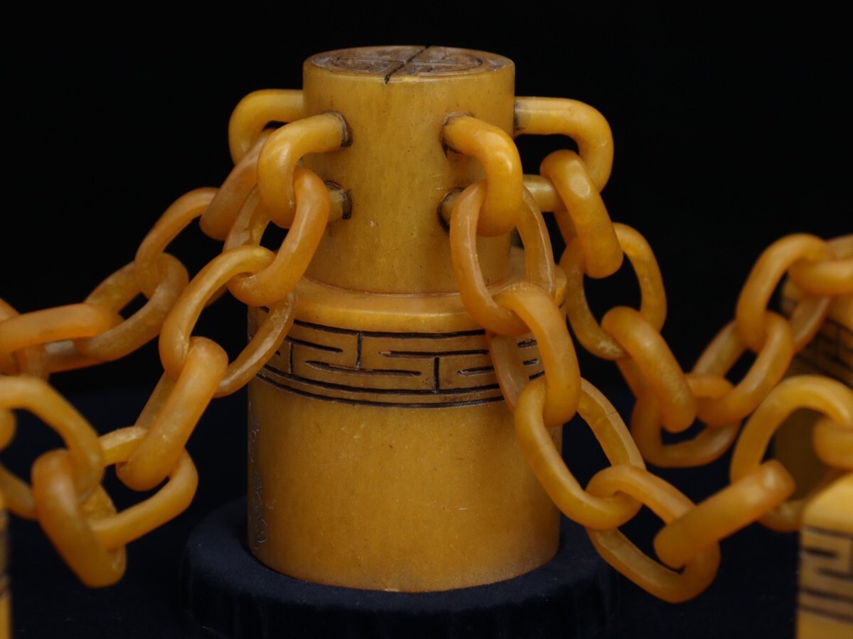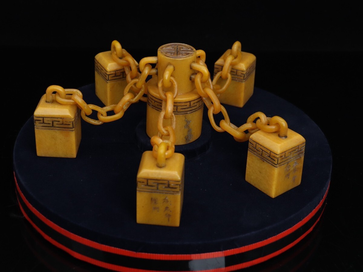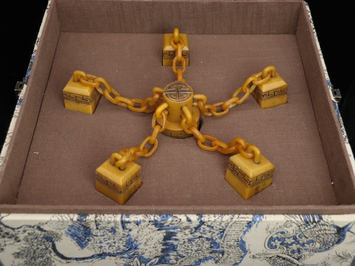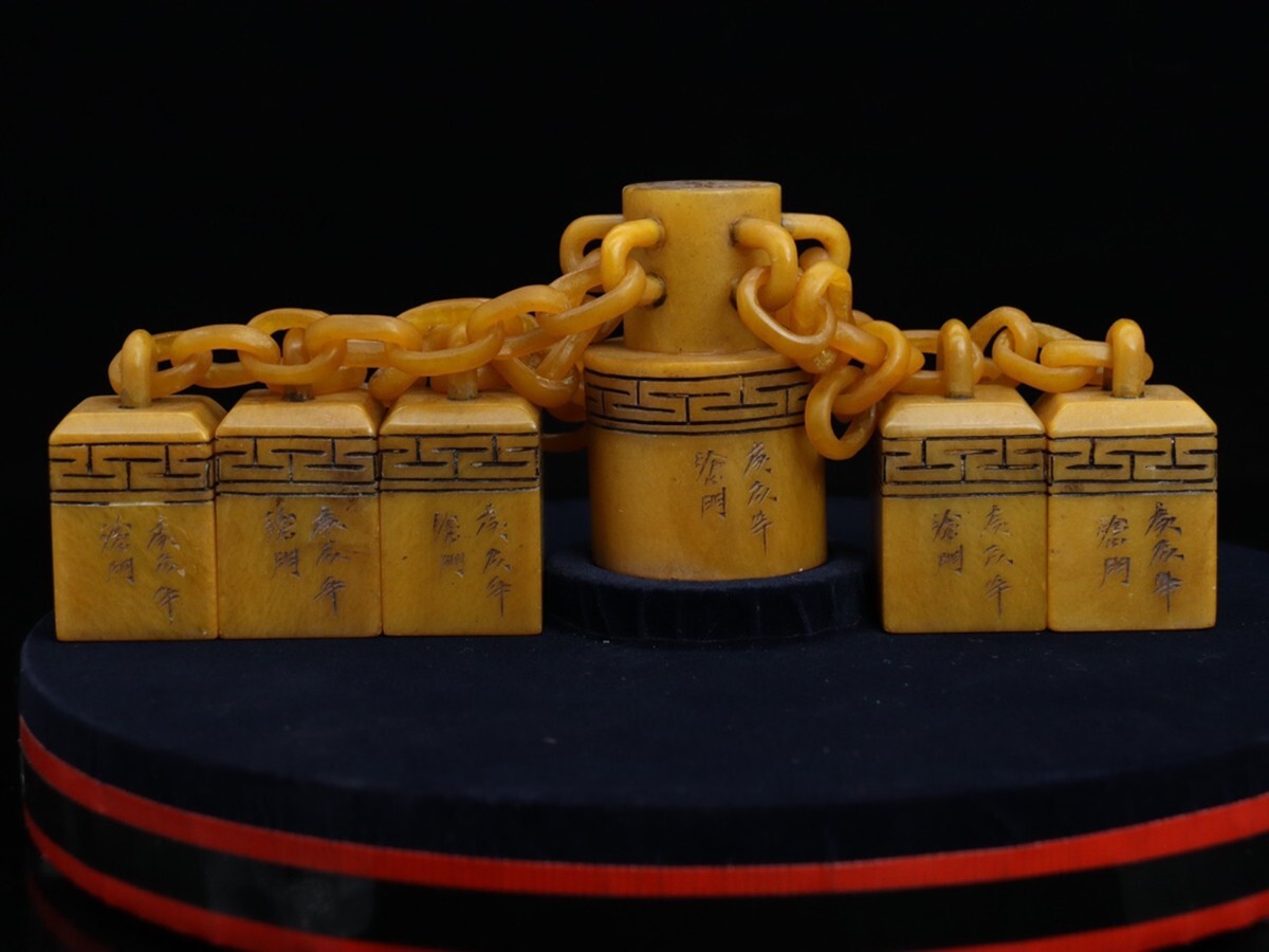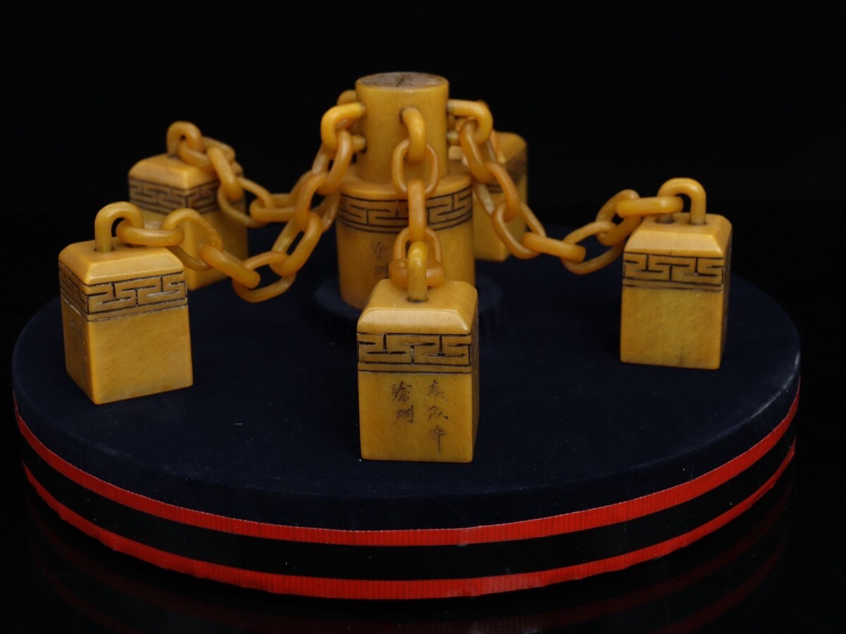 「清 滄門 老寿山石 田黄石彫り 六鏈印章」極細工 擺件 古賞物 中国古美術 旧蔵出