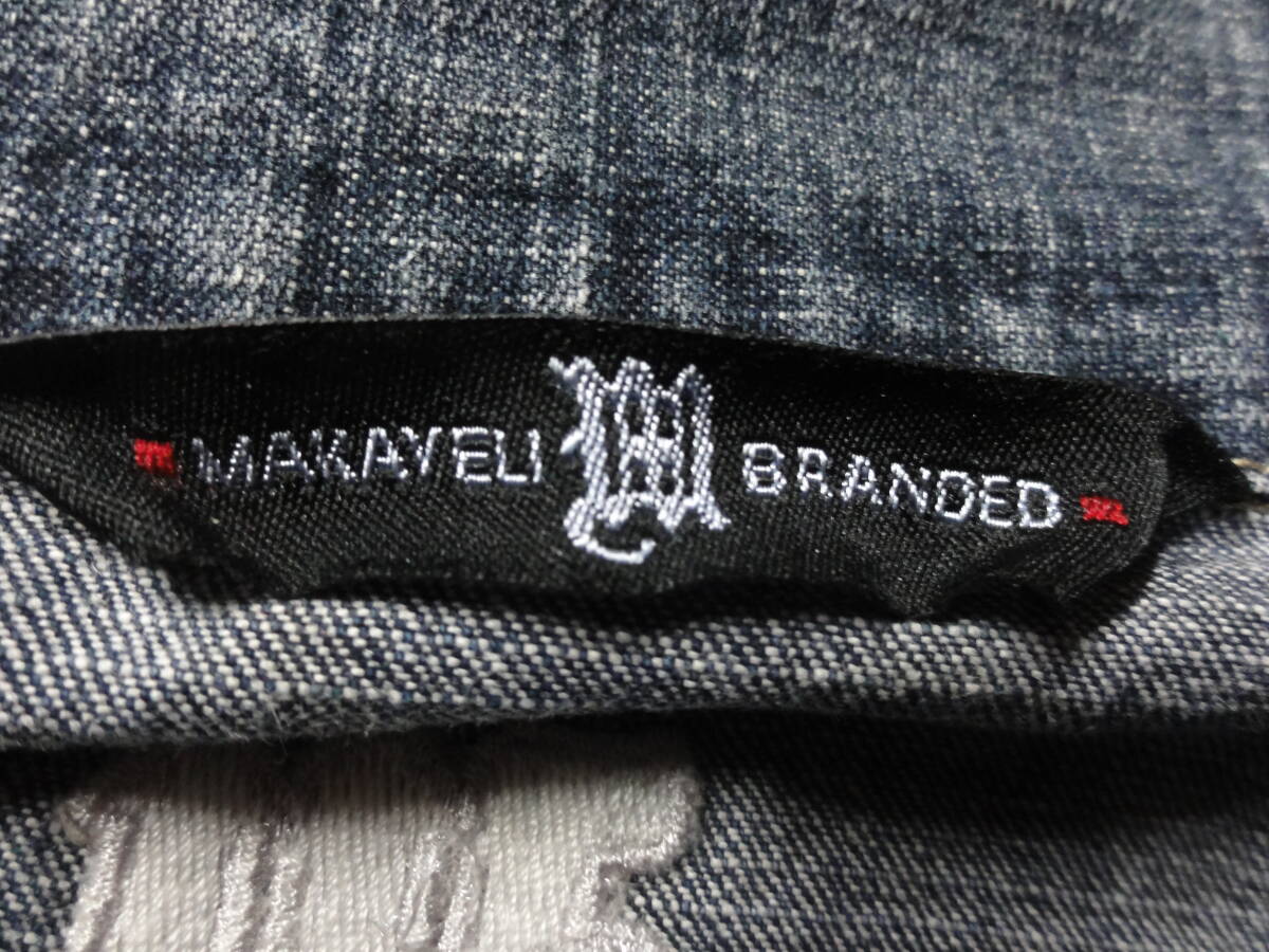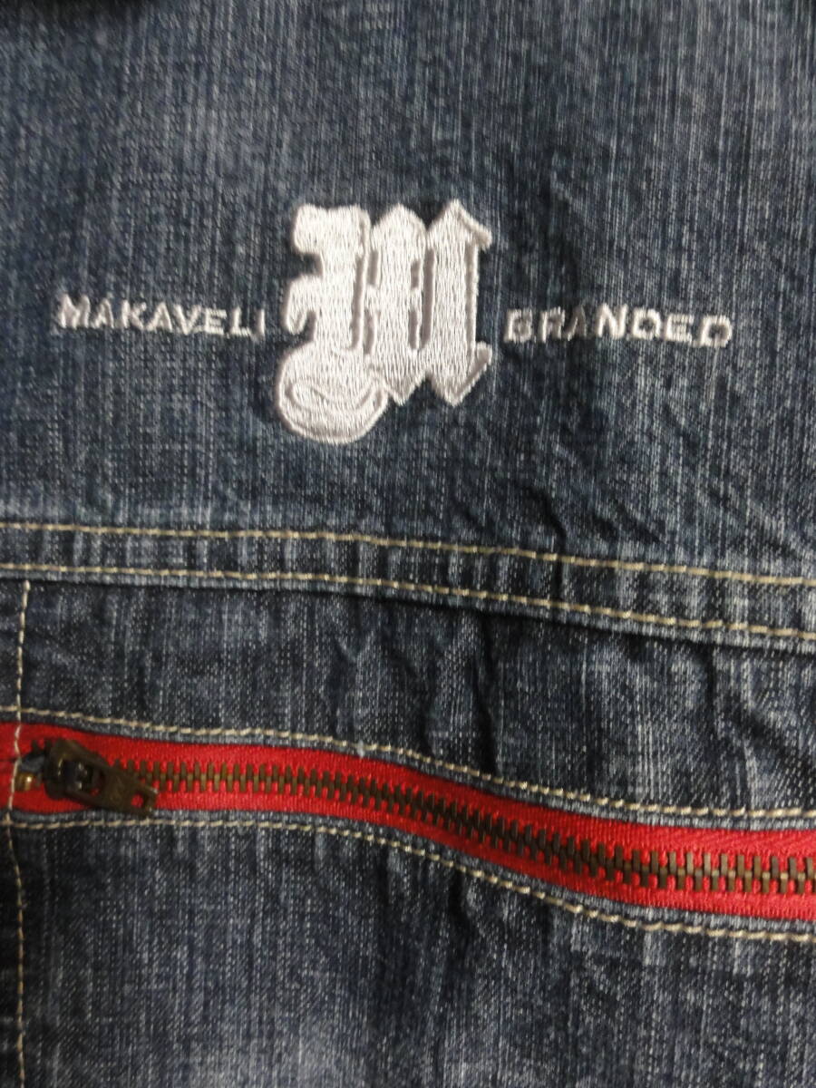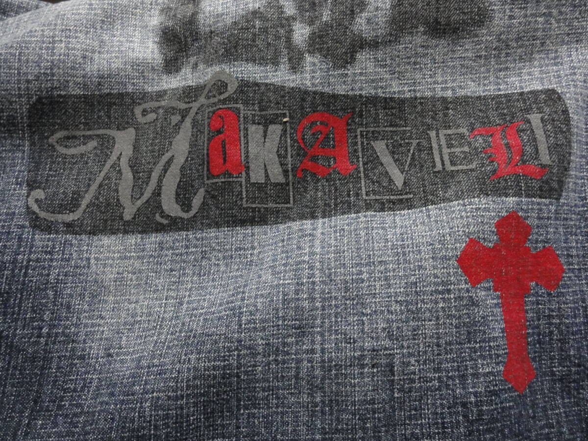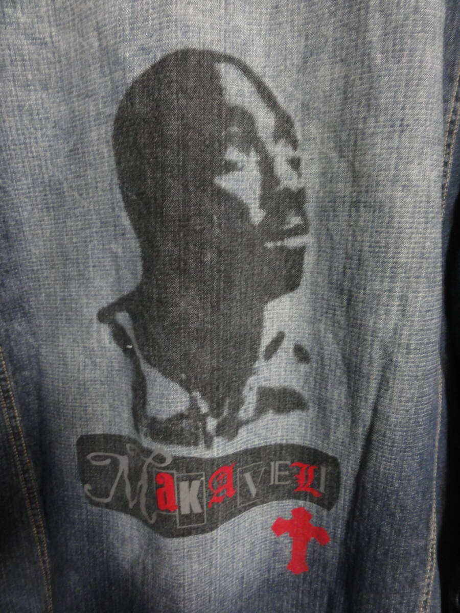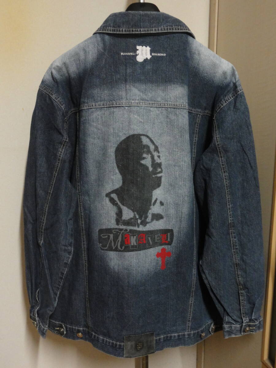 ヒップホップ~ストリート系高級人気ブランド MAKAVELI BRANDED(マキャベリブランド・2PAC) のダメージ加工デニム地・2PACプリント&刺繍付きジージャン~カバーオール系ブルゾンタイプのお洒落でかっこいいお品です。