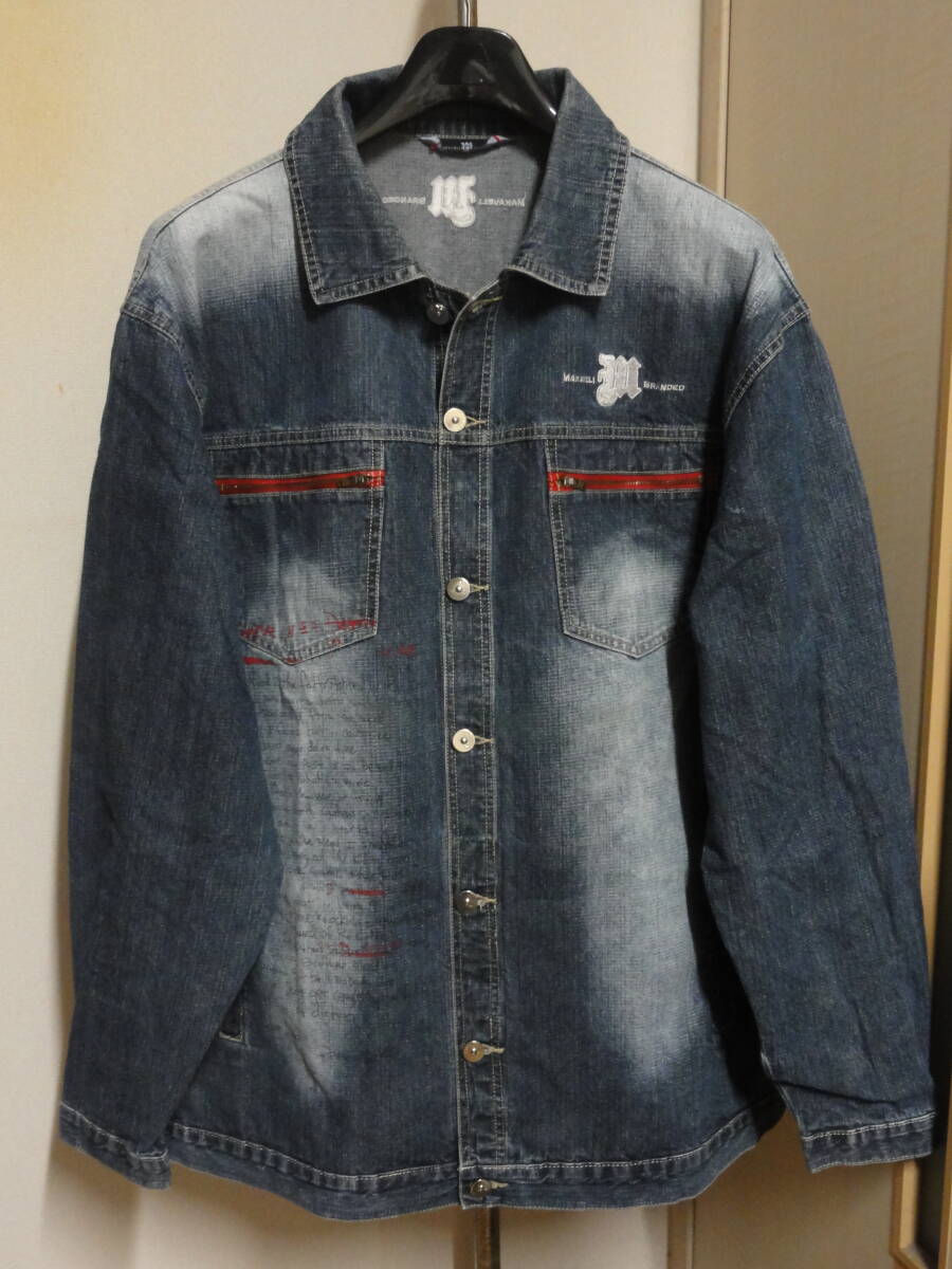 格安超特大(胸囲136cm位)レア・MAKAVELI BRANDED(マキャベリ)・ダメージ加工デニム地・2PACプリント&刺繍付きカバーオール系ブルゾン