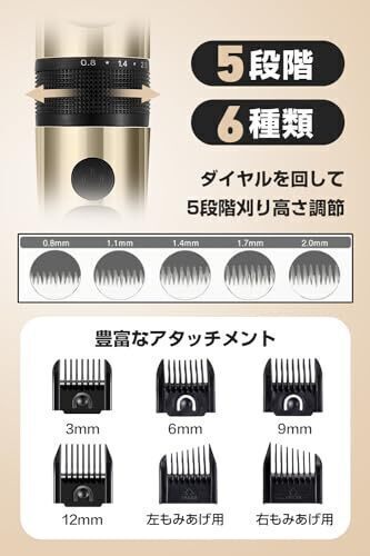 • 【5段階刈り高さ調節&6種類ガイドコーム】Happilaffバリカンにはダイヤル式で0.8-1.1-1.4-1.7-2.0mmまで0.3mmずつの5段階刈り高さ調節可能で、左右に回れば簡単に調整でき、設定した刈り高さ以下に切り過ぎません。さらに、3、6、9、12mm、左耳&右耳周りコームの6種類アタッチメントを付属して表面のぼかし髪量の調整ができ、簡単に思い通りのヘアスタイルを仕上げる。※このバリカンは最短で0.8 mmでの散髪でき、坊主頭や髭剃りには使用できませんのでご了承ください。
