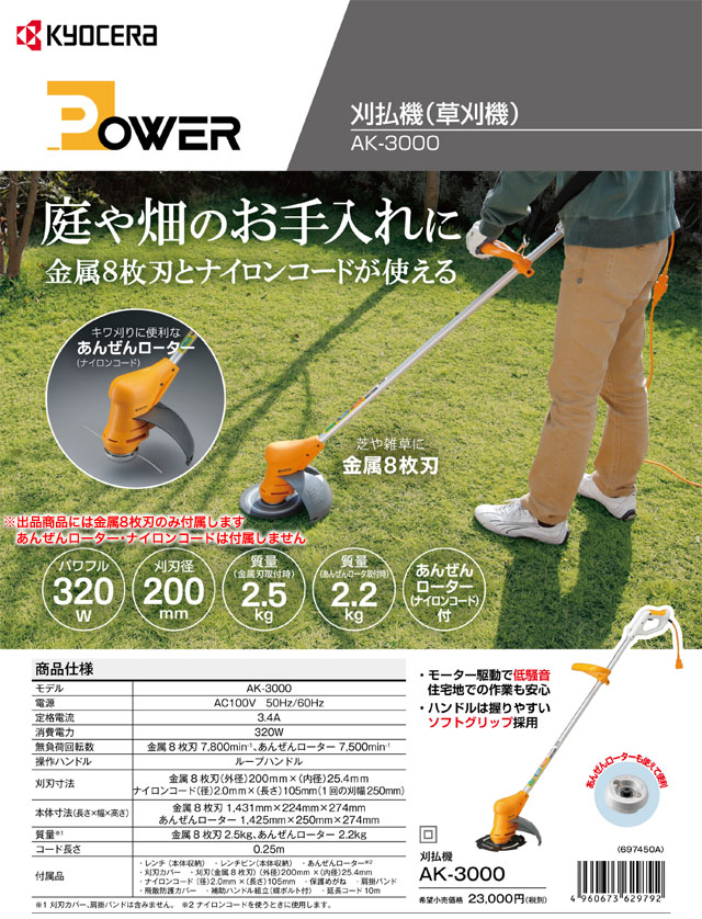 京セラ 電動刈払機(草刈機) AK-3000 を出品いたします。 ■特徴■ 芝から雑草までの刈り込み作業に。 ■仕様■