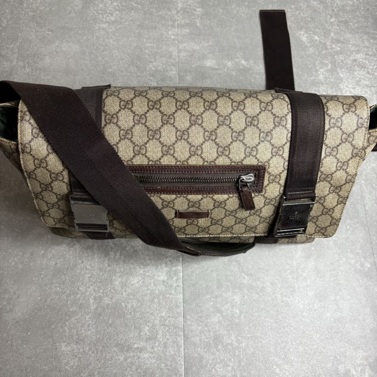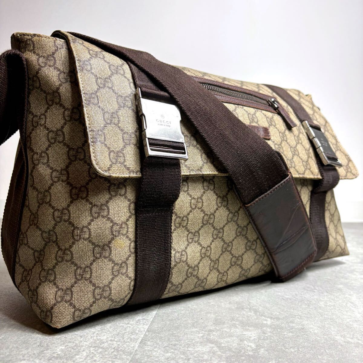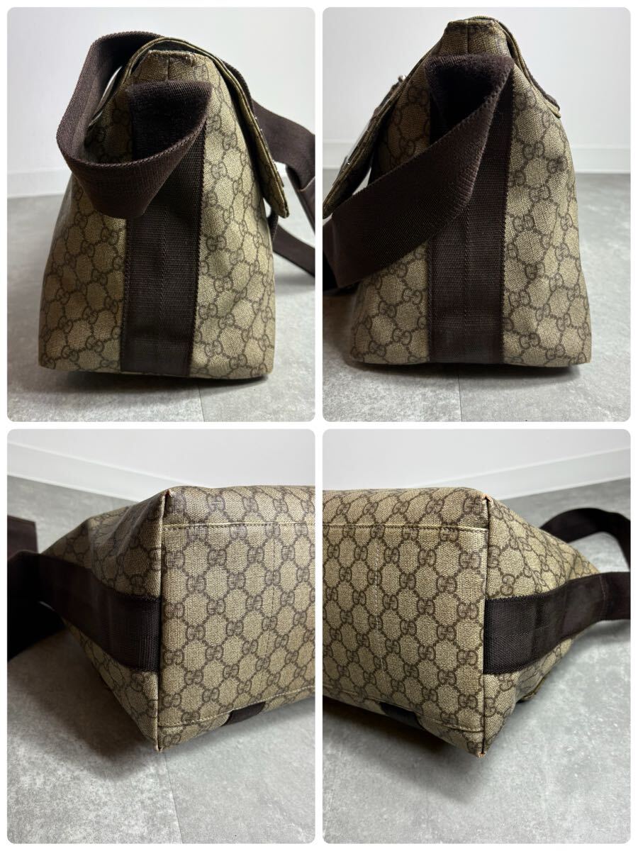 定価25万/廃盤モデル◎ GUCCI グッチ メッセンジャーバッグ ショルダー クロスボディ 肩掛け 斜め掛け GGプラス 金具 PVC レザー 茶