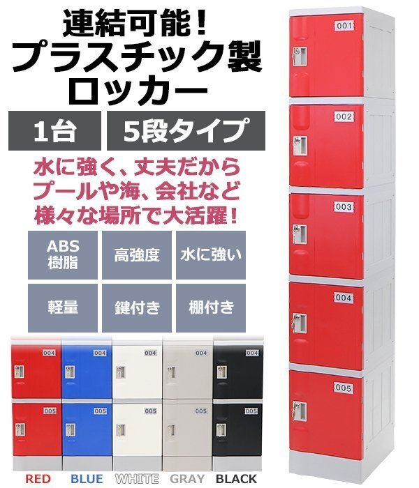 商品名 | 送料無料 プラスチックロッカー ロッカー エコノミーモデル 連結可能 5人用 5段 1台 おしゃれ 選べる5カラー 水に強い 丈夫 鍵付き スペアキー付き ABS樹脂製 樹脂ロッカー プラスチック製 収納 プール 海 事務所 会社 病院 更衣室 貴重品 オフィスロッカー オフィス家具 隙間家具 plalocker51 |