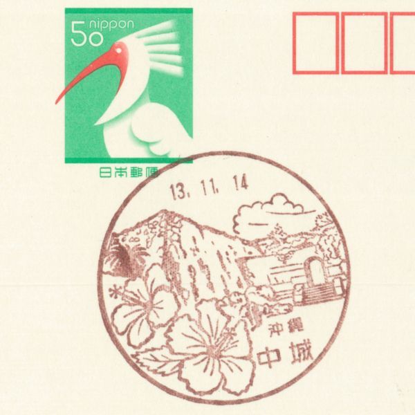 風景印☆初日☆沖縄・中城・H13.11.14・ハイビスカス