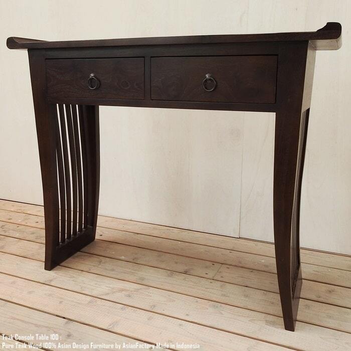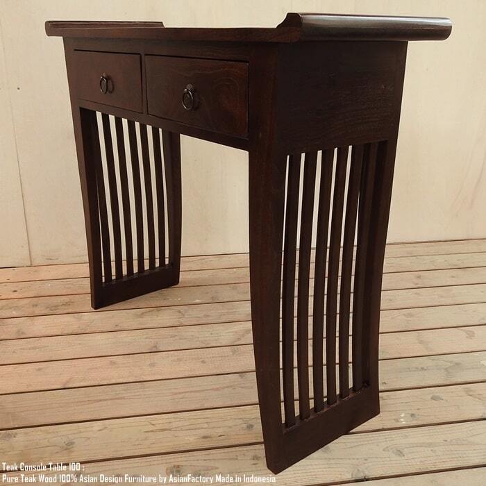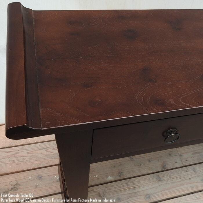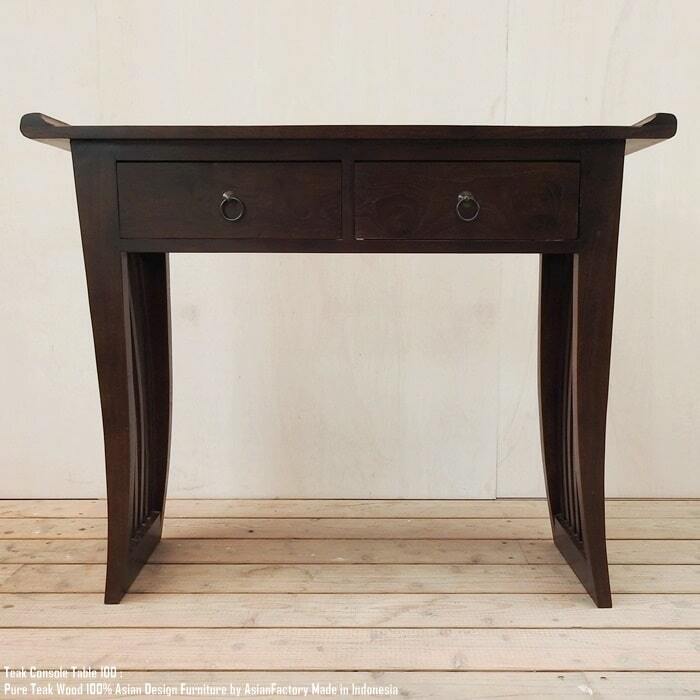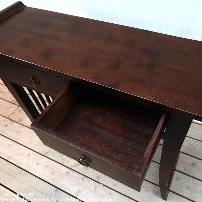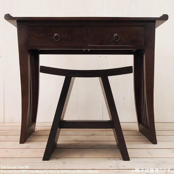 とてもスタイリッシュなデザインのコンソールテーブル100cmモデルです。 お部屋や廊下の飾り台としても活躍してくれます。 お部屋のアクセントづけにいかがでしょうか。 素材はもちろんチークの無垢材です。 カラーは重厚なダークブラウンちょっと濃いめです。 ■サイズ : 幅99~100cm×奥行34cm×高さ79~80cm ■天板の高さ:77~78cm ■床面から引き出し間の高さ:59~60cm ■脚部間の内寸幅:72cm ■引出しの内寸:幅32cm×奥行24cm×高さ9cm ※インドネシアの職人によるハンドメイドの為、多少の誤差はお許しください。 ■素材:チーク材(総無垢材) ■カラー:ダークブラウン ■塗装:セラック塗装(シェラック塗装) ■原産地 :インドネシア