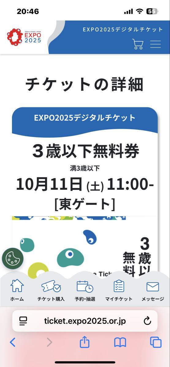 2025大阪・関西万博の10月11日(土)東ゲート11時入場の予約済みチケットです。