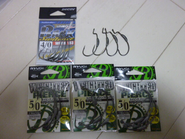 RYUGI リューギ:ウェイテッドピアス WEIGHTED PIERCE #5/0 1/16ozが3袋、DECOYのバックスイッチャーと、開封品もたしかウェイデットピアスだった記憶ですが自身がありません、重さは4つとも1.8gです。