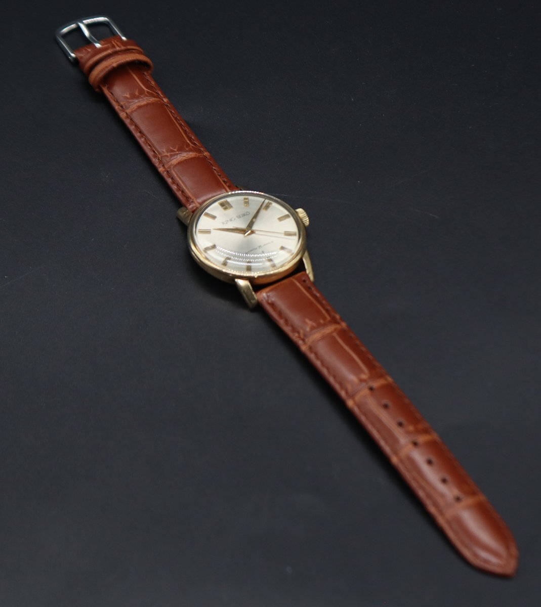 14K GOLD FILLED 100MICRONS(分厚い金張り)ケース ・SD文字盤(金無垢バーインデックス) ・国内メーカー新品革ベルト&尾錠 |