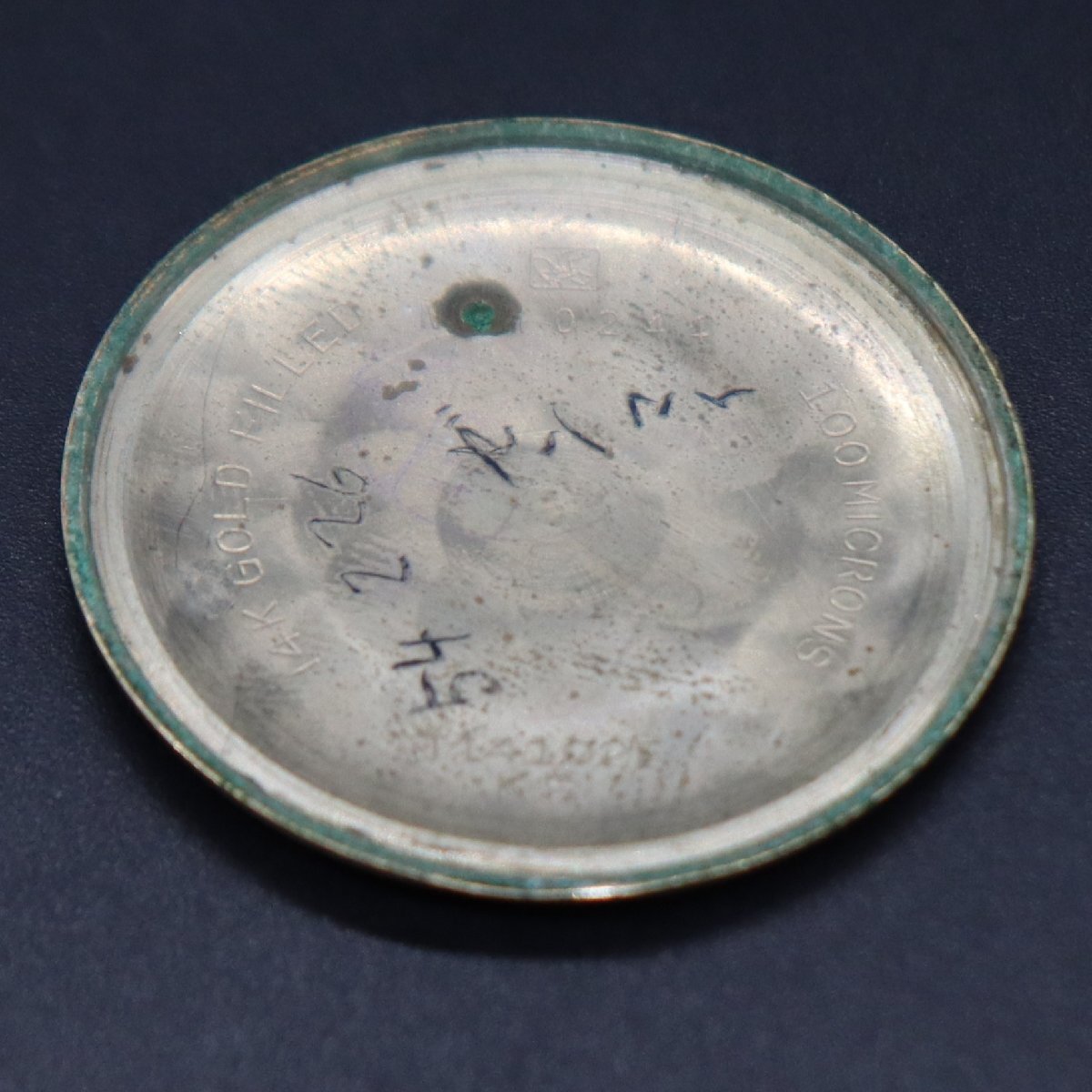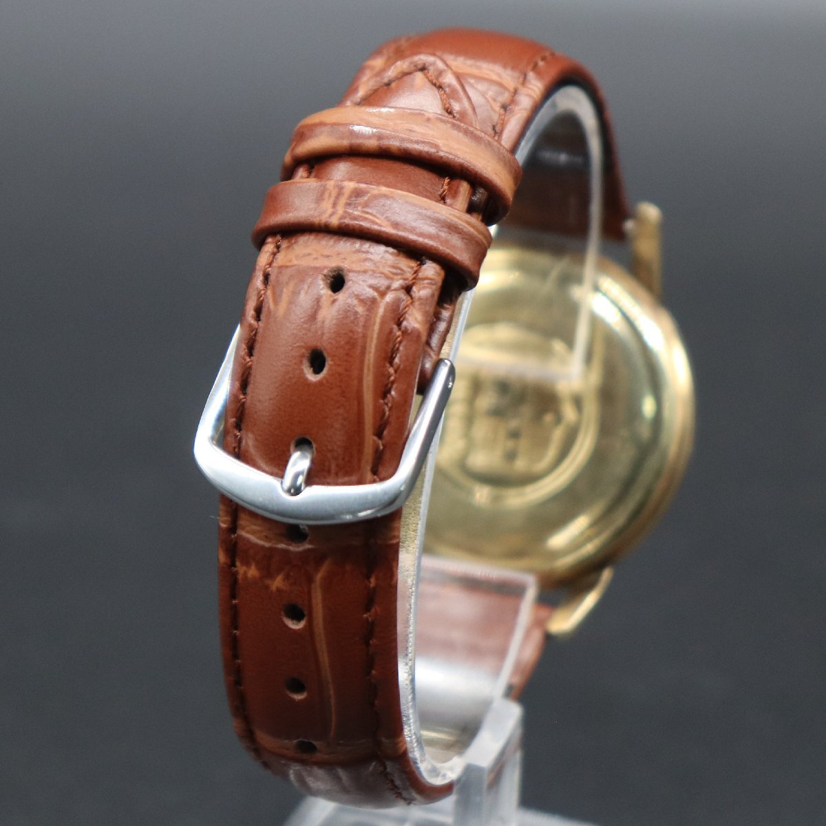 平置きで12時間動作確認済み、大幅な遅れなく稼働中です。 リューズ巻き止まりOK、一段引きで時刻調整可能です。 ※アンティーク時計を長くお使いいただくため、 丁寧に、やさしく操作していただくようお願いいたします。 アンティークですので全体に経年に伴うキズ、 金メッキの特有の汚れ、ラグ足に打痕、凹みなどの傷みが 見受けられますが、風防は目視でキズなく、きれいです。 文字盤・針・インデックスは微細なチリ、 小汚れございますが、ロゴや印字は消えなく鮮明です。 雰囲気を損なうような大きな損傷はなく、 経年を考えると、比較的きれいなダイアルかと思います。 リューズは非純正ですが、巻き上げ軽快です。 裏蓋、盾メダリオンは概ね良好です。 裏蓋内側に、純正ケースの証である鶴マークございます。 バーインデックスは、金無垢です。 ベルトは、新品の国内メーカー製革ベルトに交換済みです。 アンティークですので、詳しくは画像にてご判断願います。 | |