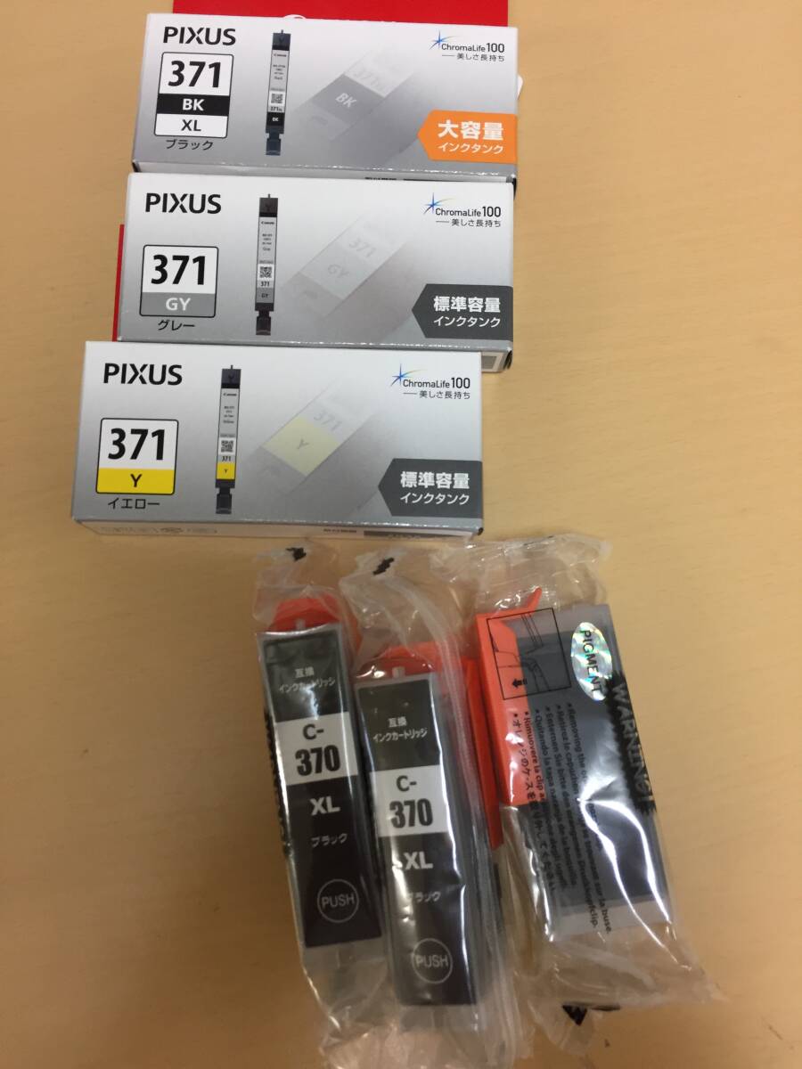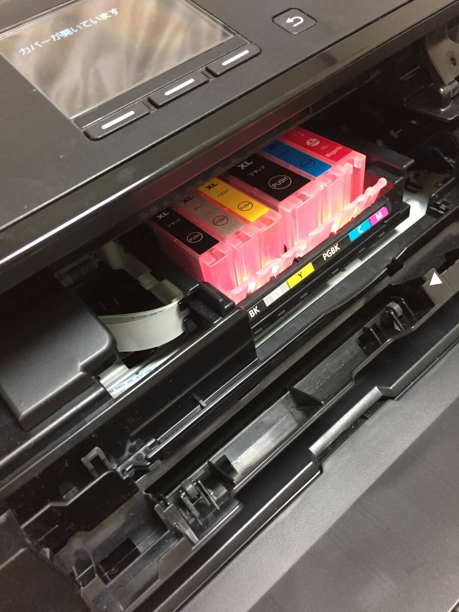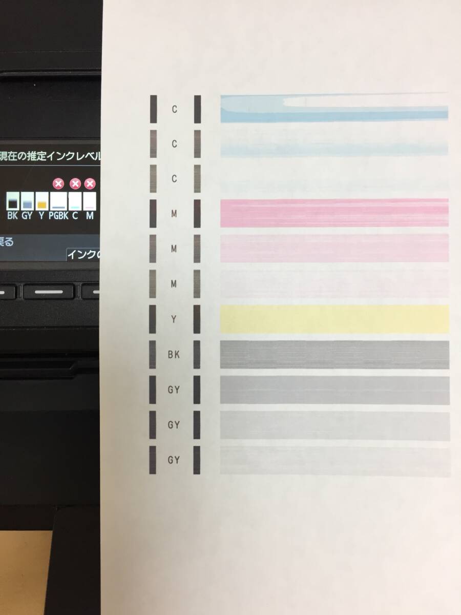 インクノズルクリーナーとテスト印刷をしたところ青と赤が擦れていてインク残量モニタのようにシアンとマゼンタが減っているためと思われます。