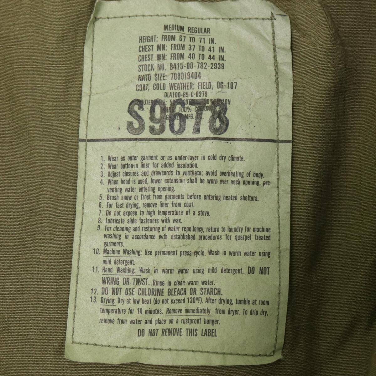 | 【商品管理番号】 A3940 【ブランド】 /米軍実物 U.S.ARMY 【サイズ】 MEDIUM REGULAR 【実寸サイズ】 肩幅:約52cm 着丈:約78cm 身幅:約57cm 袖丈:約60cm 【主な素材】 表地 : コットン 裏地 : 13791 【色】 オリーブ 【仕様】 80年代 1985年 フード収納可能、フードドローコード、ウエストドローコード、裾ドローコード、ライナー接続可能 ミリタリー M-65 フィールドジャケット 3rd 【状態】 特記事項: 所々に薄汚れ | |||