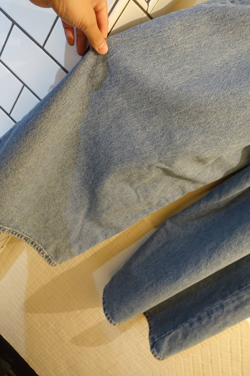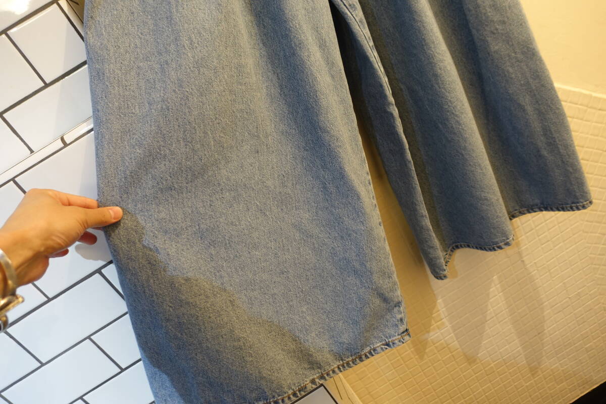 試着のみ 新品同様です。かるいシワはご了承下さい。色落ちは加工です。サイズS ウエスト平置きで33 股下71 股上36 裾幅45 よろしくお願いします!