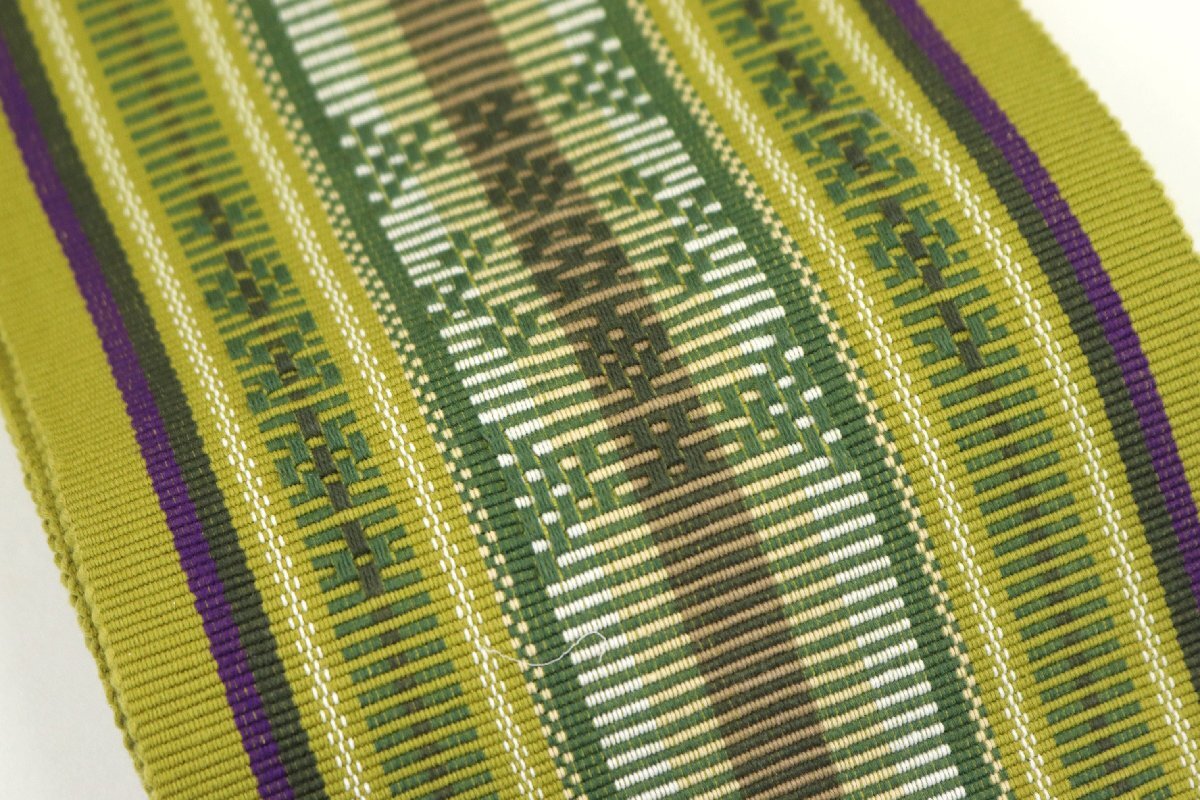 ◆新品 未仕立て 沖縄県指定伝統工芸製品「読谷山ミンサー」手織り四寸帯(半幅帯)をご紹介致します。 こちらの帯は、未仕立てでございます。お手元に届きましたら、両縁をかがりお使いください。 いにしえから織られてきたみんさー帯(みんさーふ)は藍で染められた細帯でした。 ややコシのある帯地は、菜種油色のお色目でございます。紫色、緑色、白色、灰茶色のお色目の糸で、縞模様が表現されており、そこには、可愛らしい模様が織り上げられております。 軽やかで締めやすい半巾帯は用途も広く、一本お持ち頂くと大変重宝いたします。 |